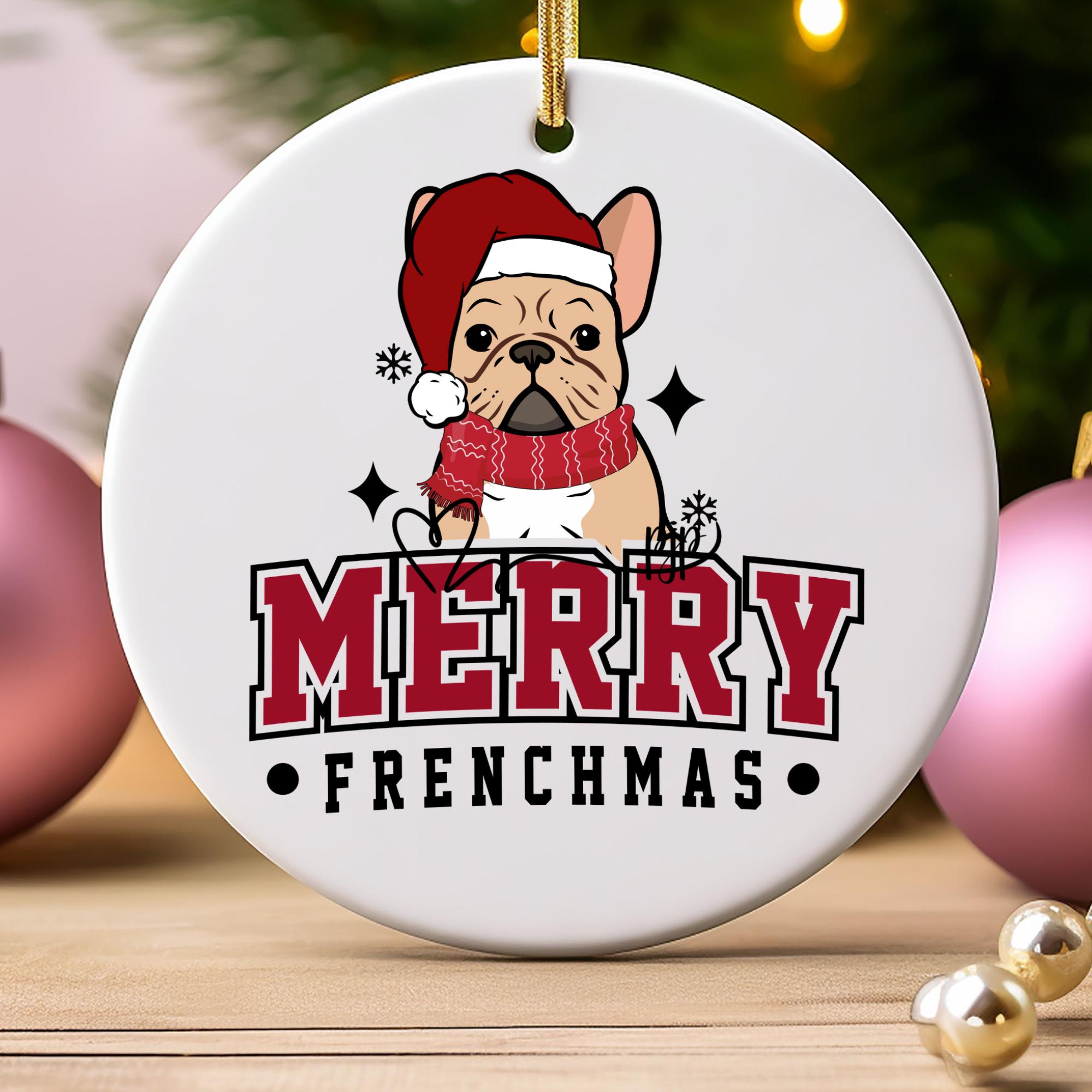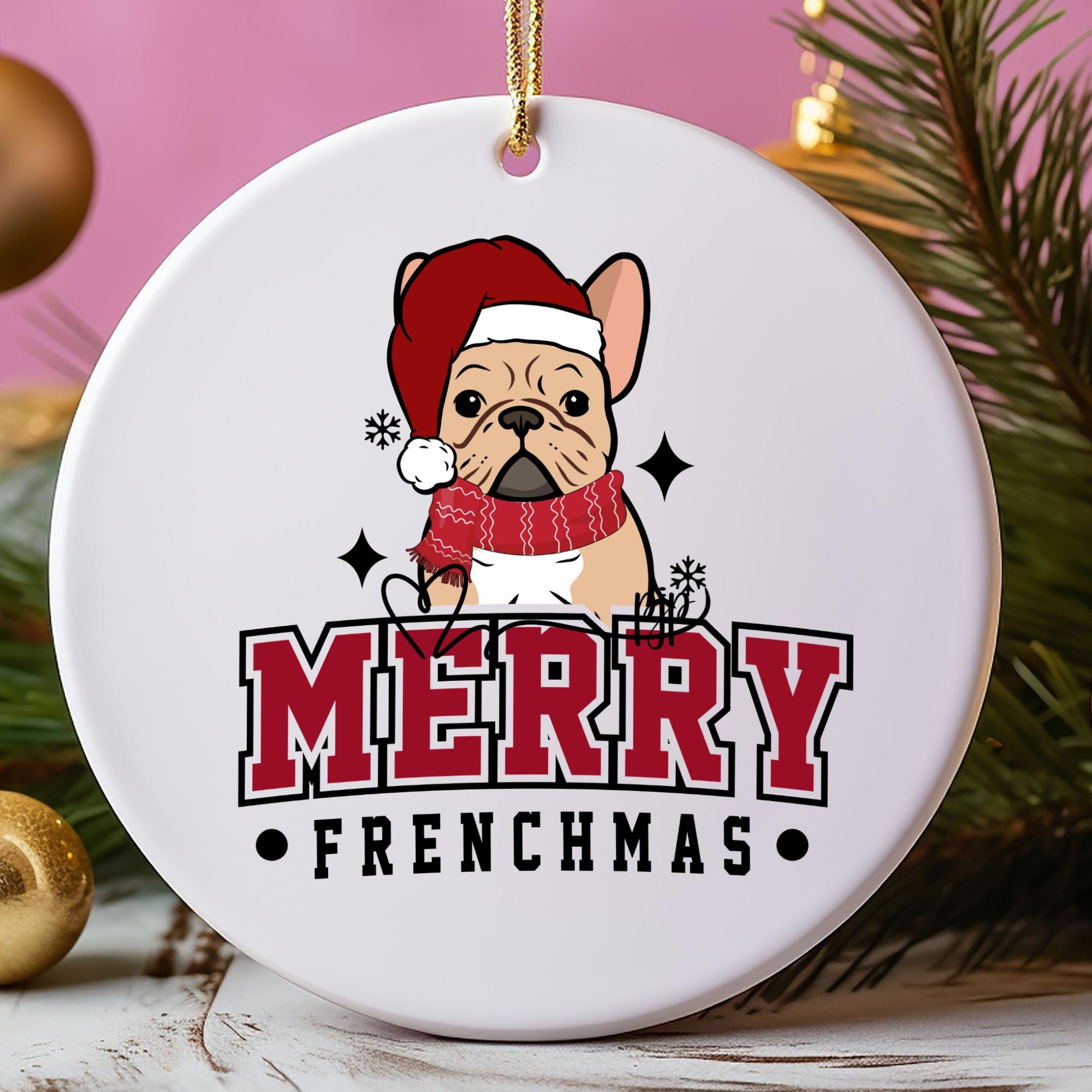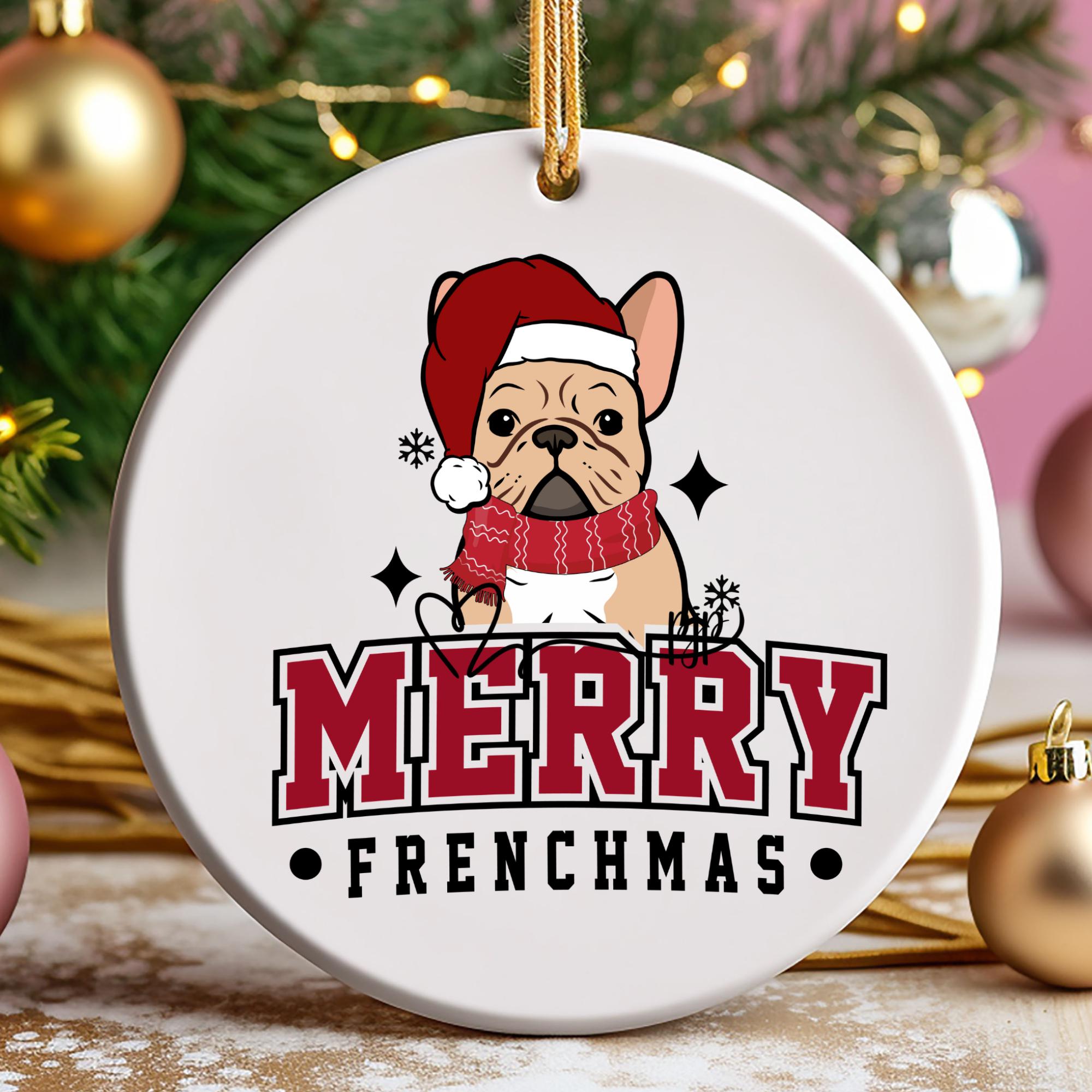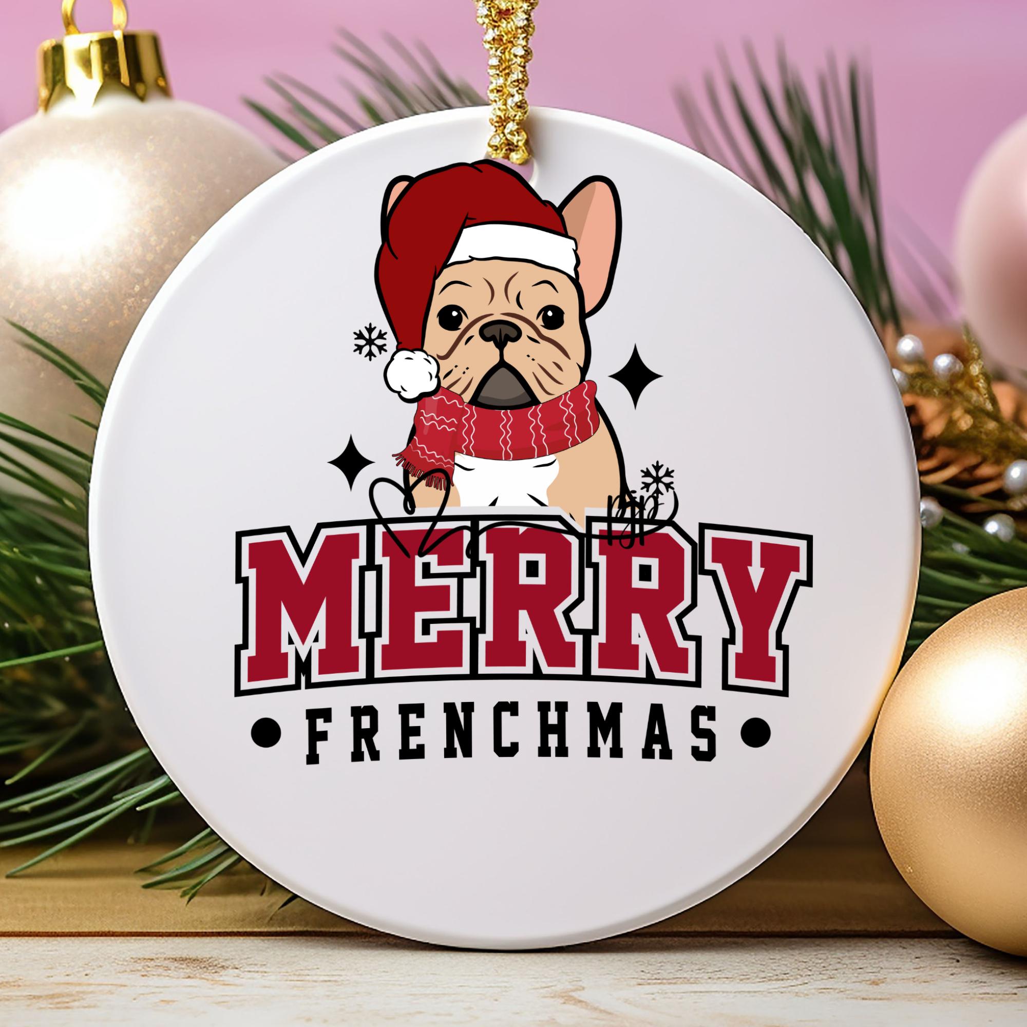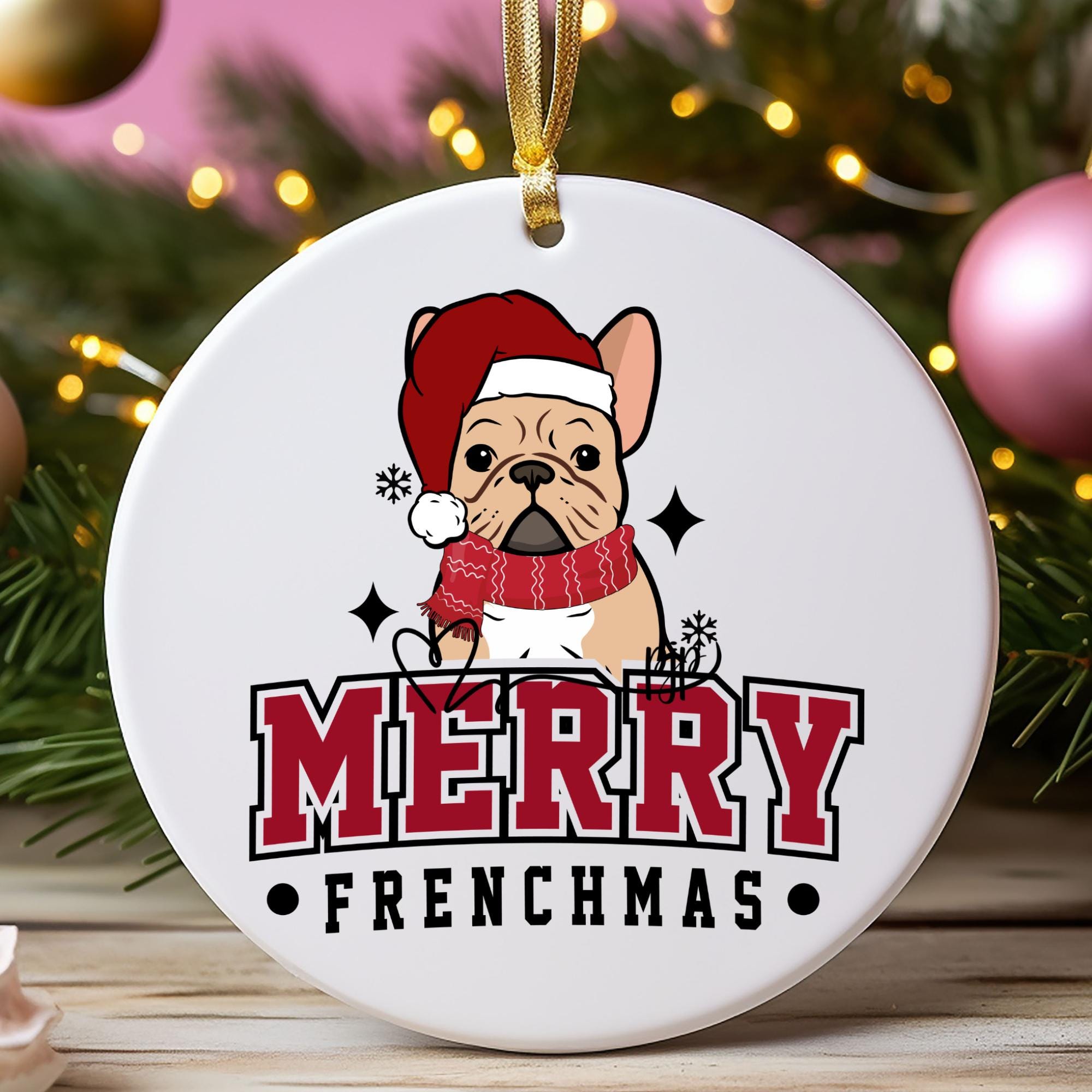 Unique Frenchie Christmas ornaments that will add a touch of charm to your holiday tree. Perfect as a gift for French Bulldog lovers and anyone who enjoys festive decorations.