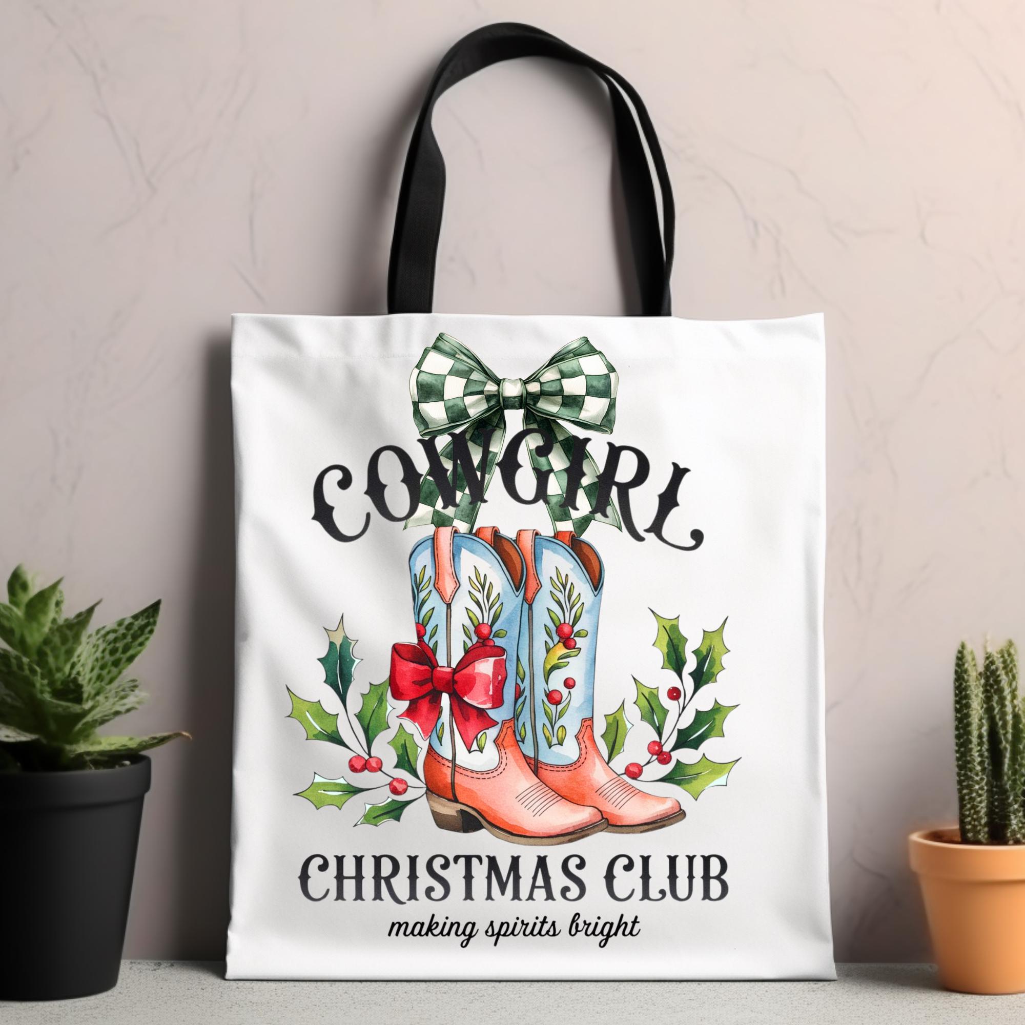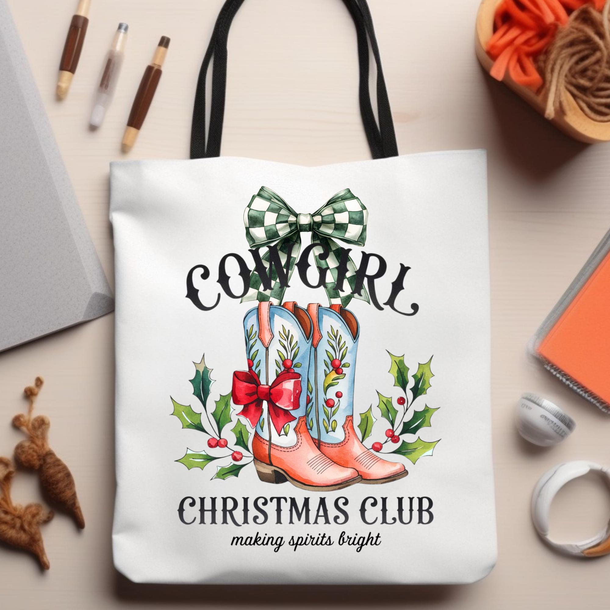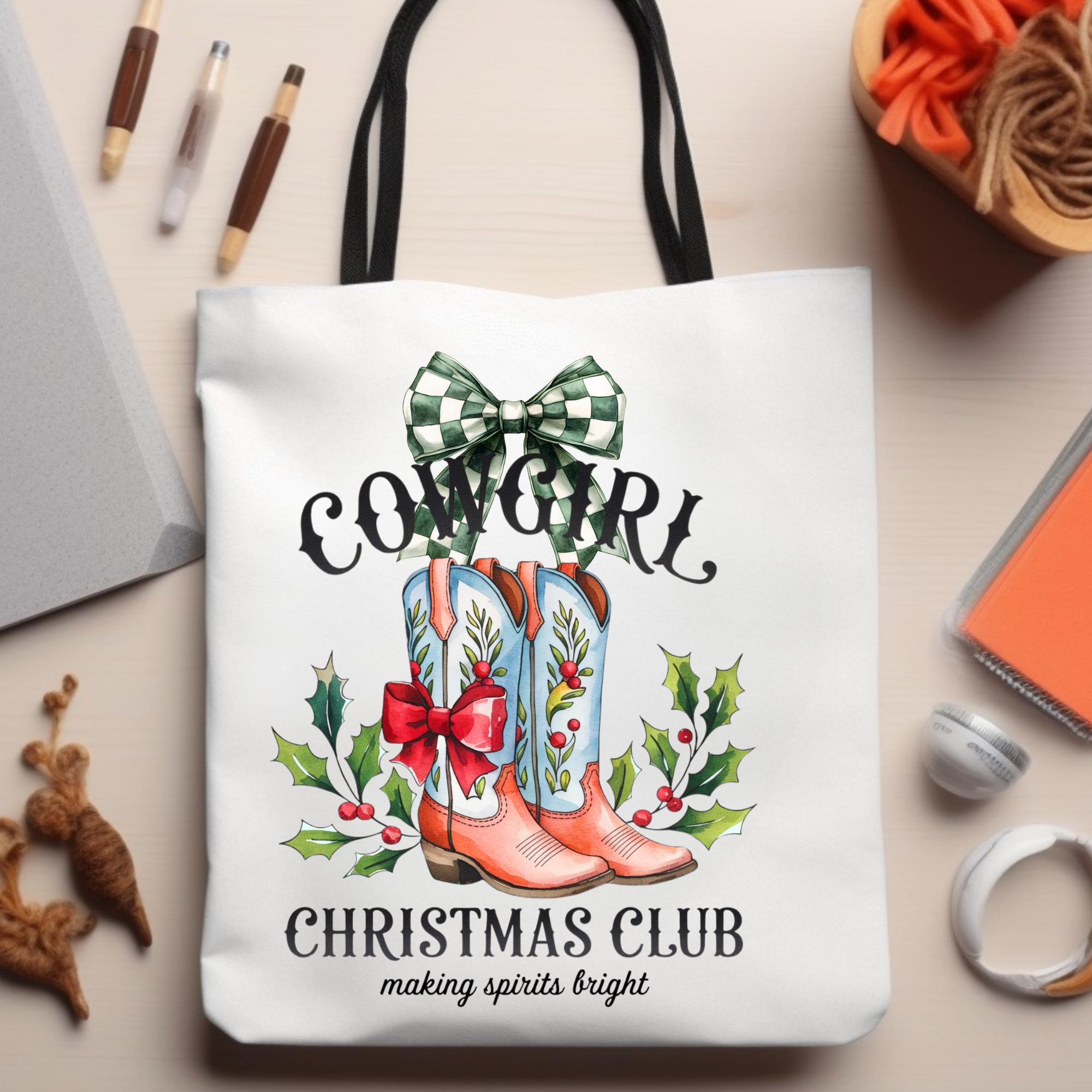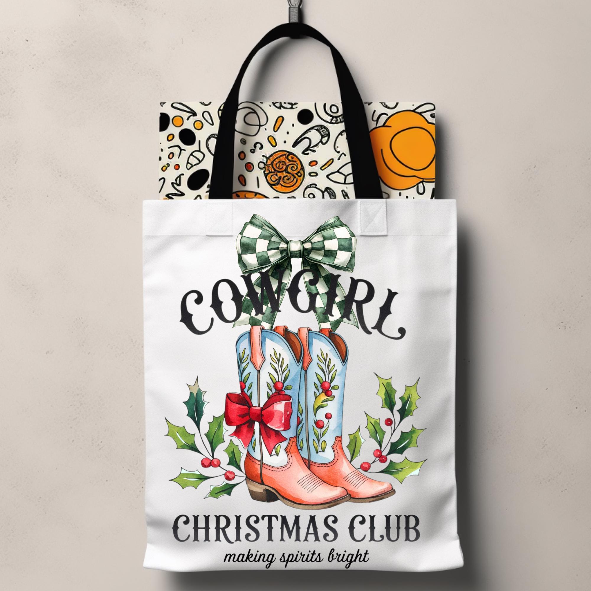Cowgirl Christmas Club Tote Bag, Western Holiday Tote, Girly Xmas tote bag, Festive Cowgirl tote, Bows Design Cowgirl tote
