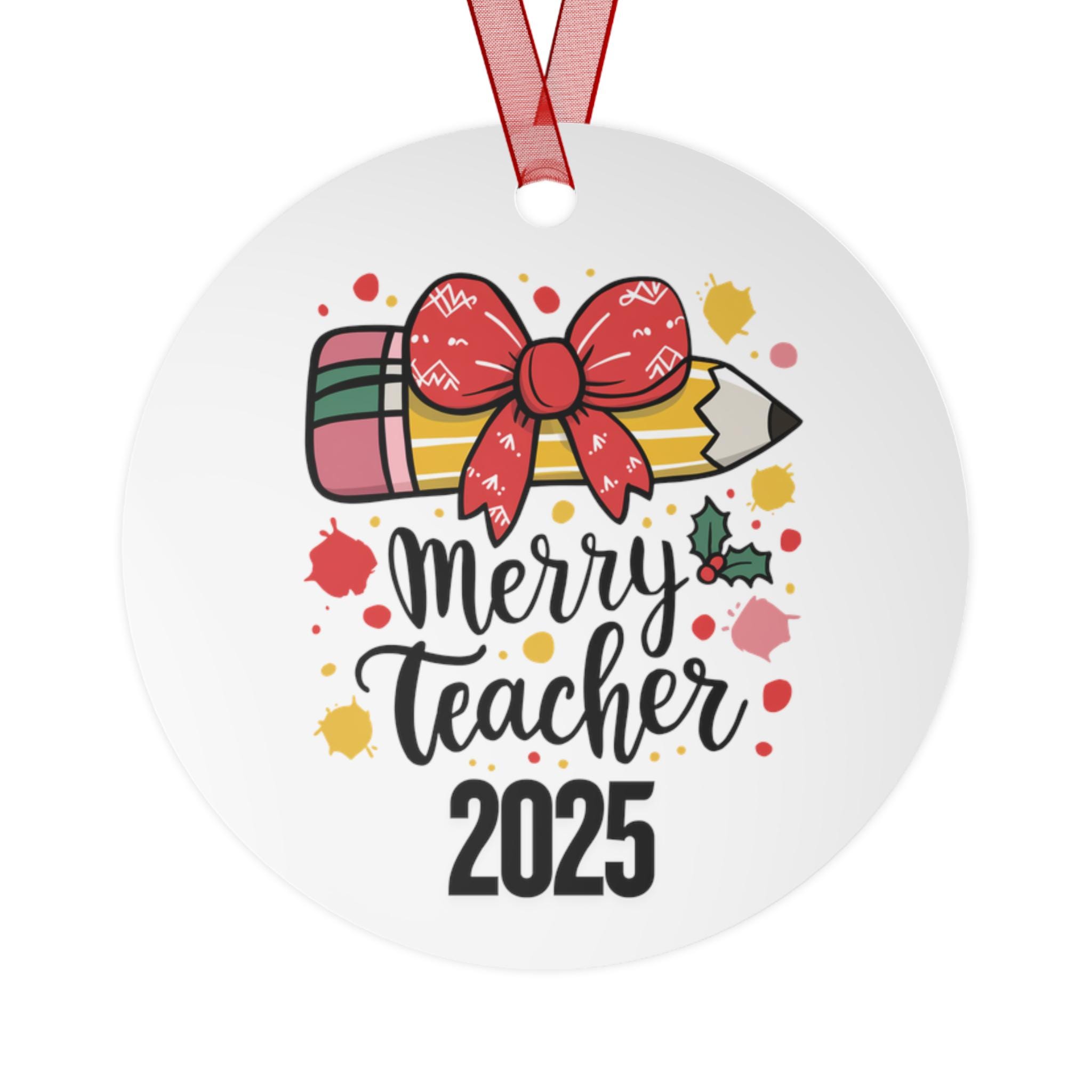 Metal Teacher Christmas ornament, perfect for gifting to teacher groups during the holiday season. - with vibrant colors and a durable aluminum material. Each ornament includes a red ribbon for hanging.