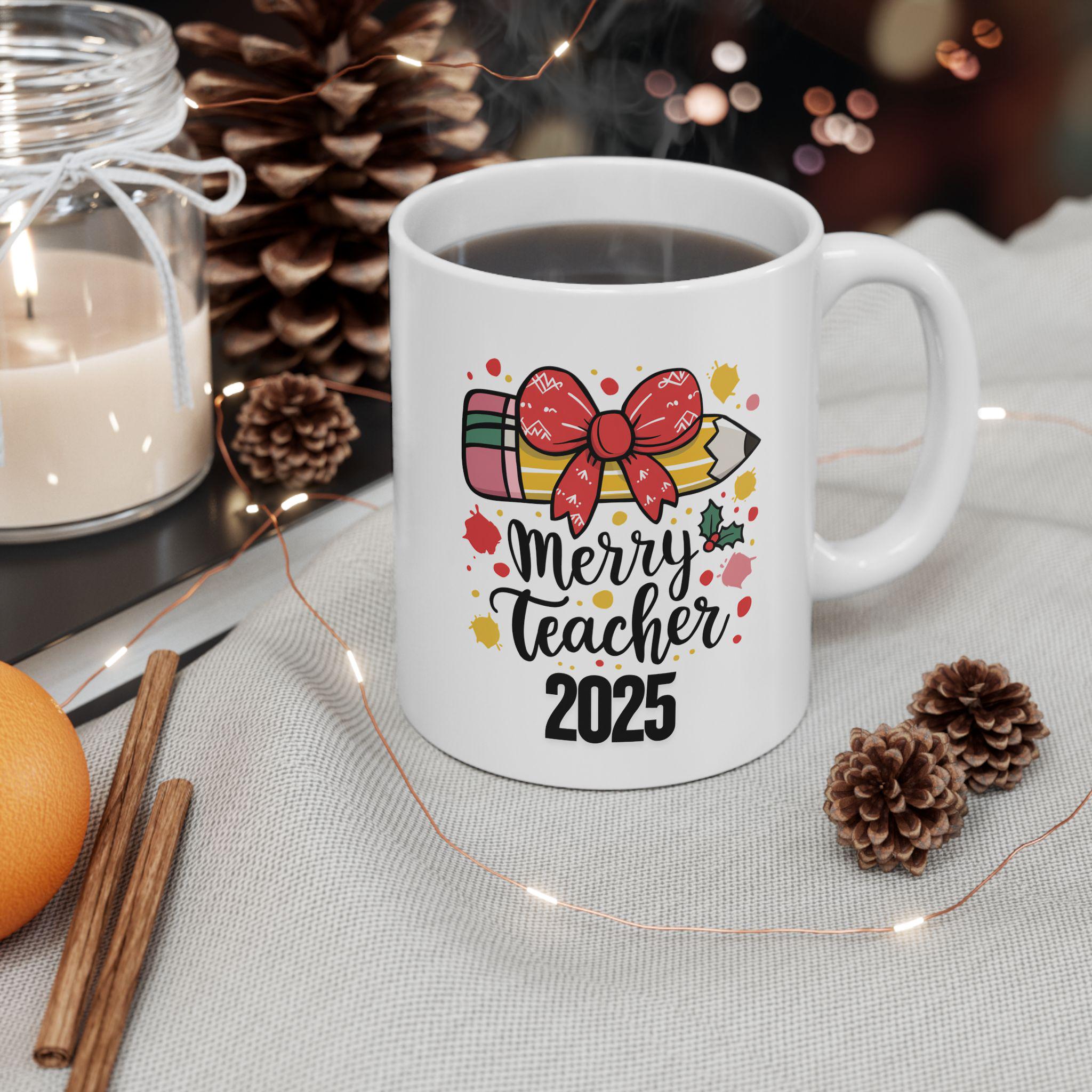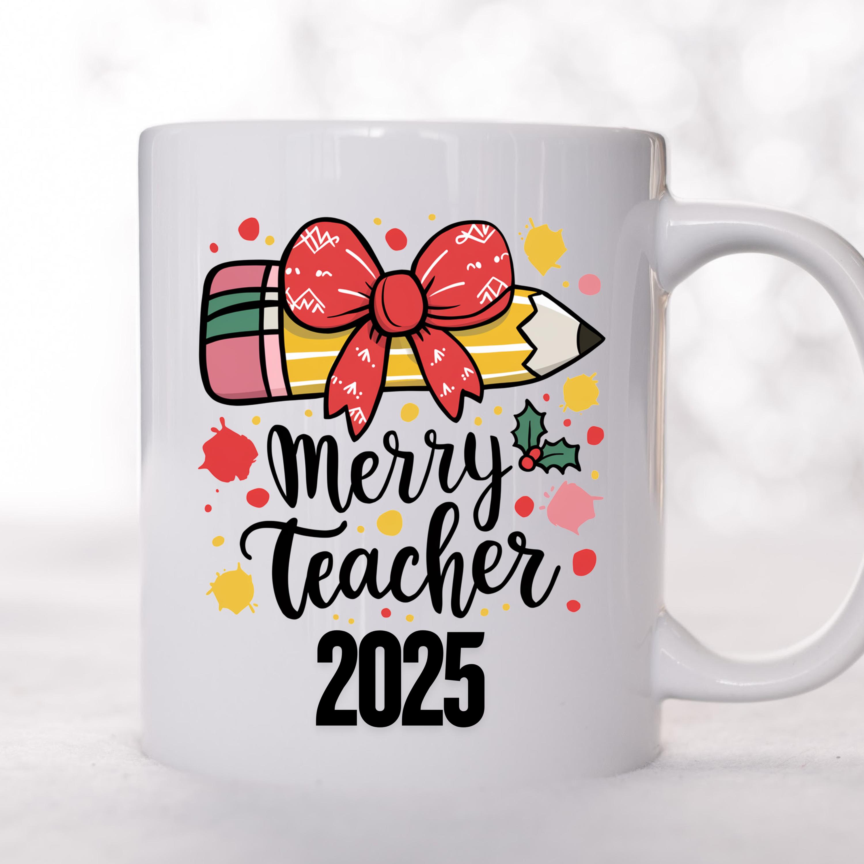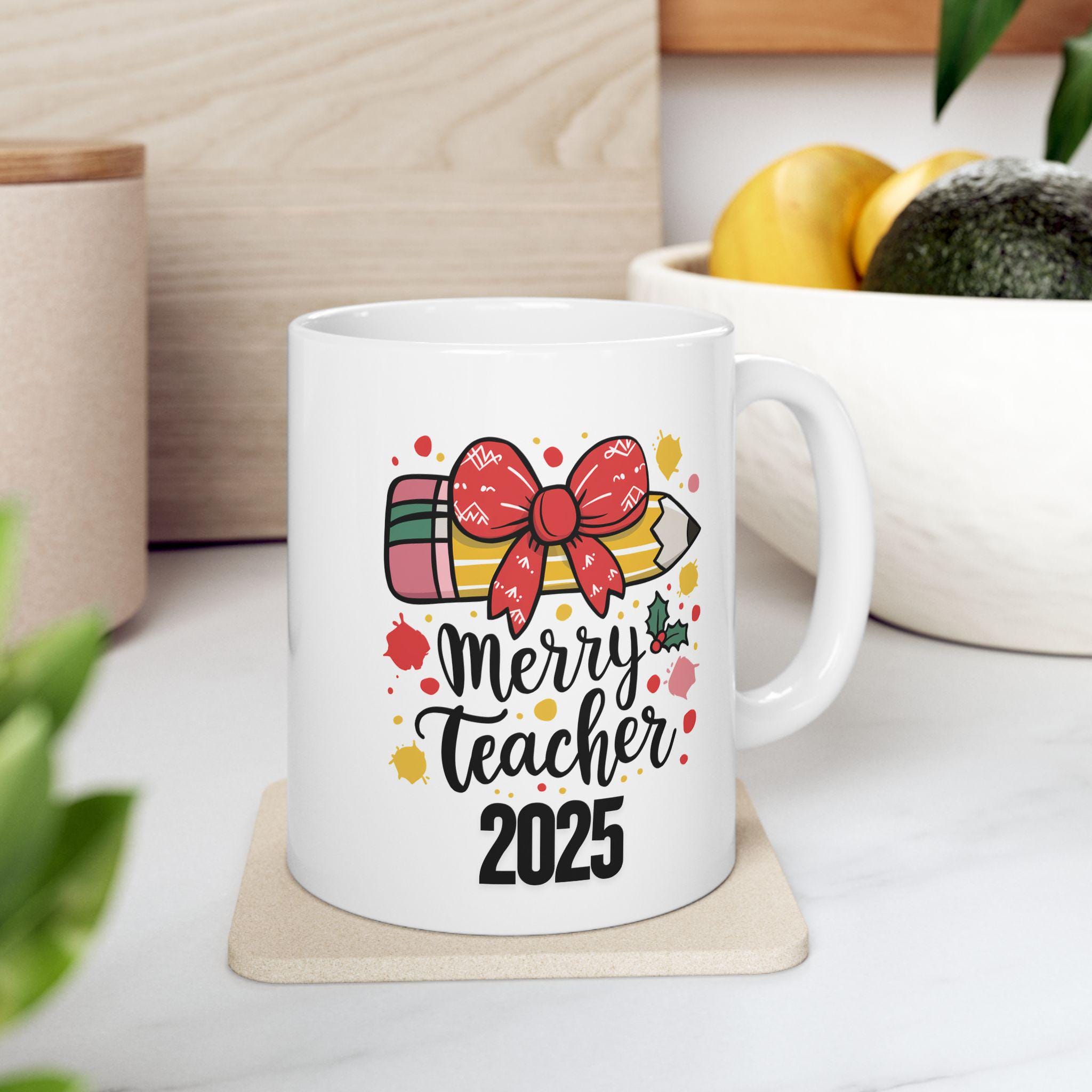 Celebrate Christmas 2025 with this Merry Teacher ceramic mug. Perfect as a gift for teachers during the holiday season, this mug features vibrant colors and Microwave and dishwasher safe, this mug is both practical and festive.