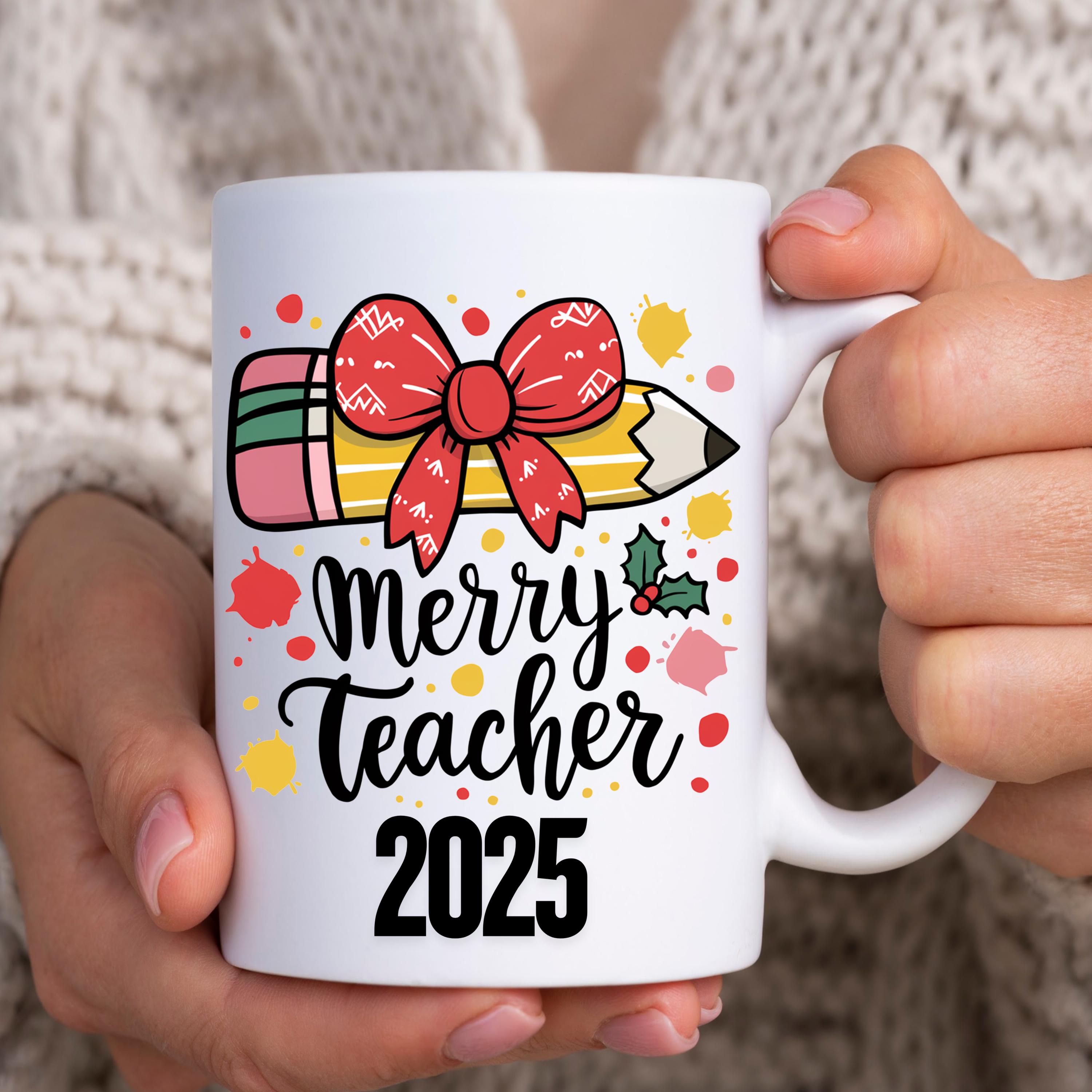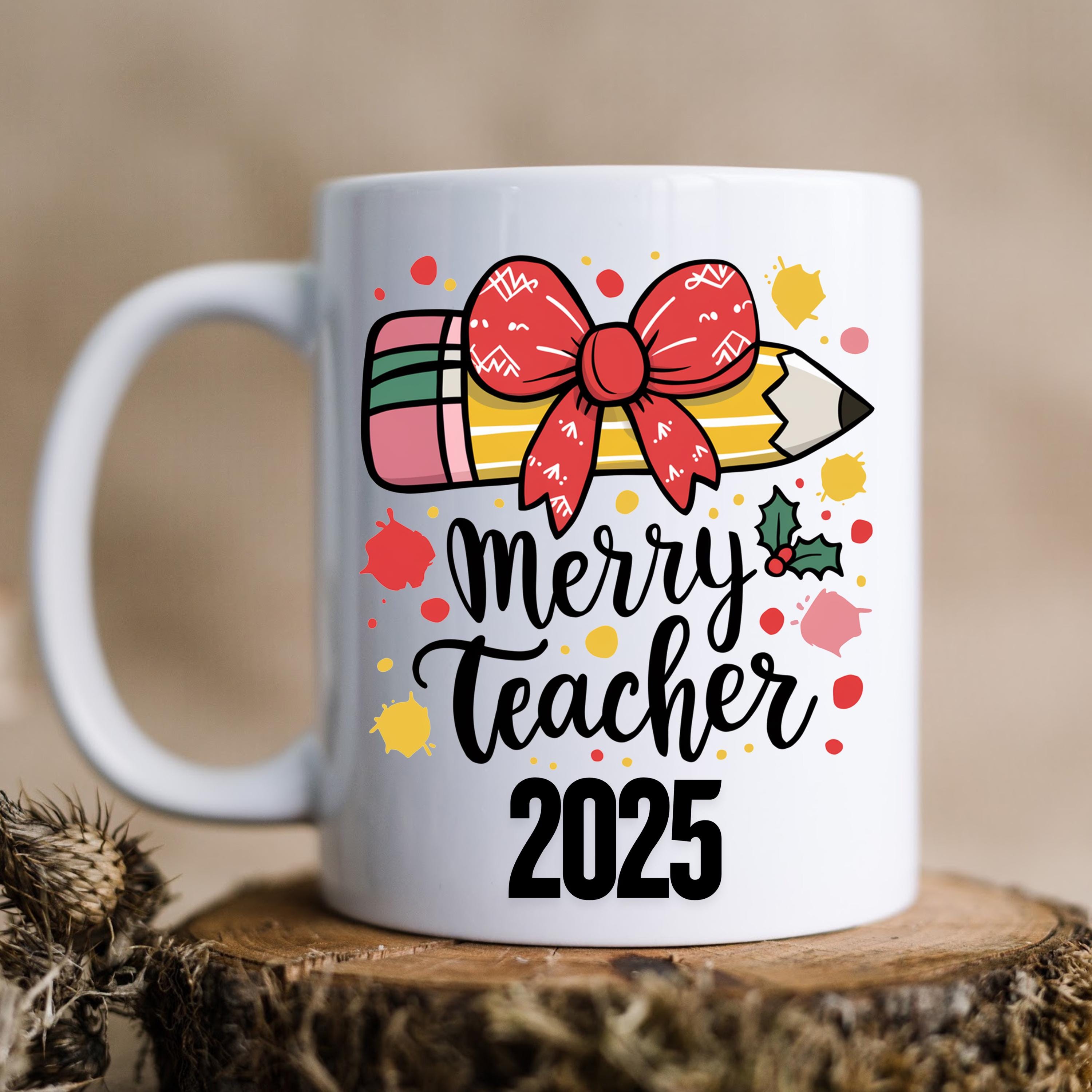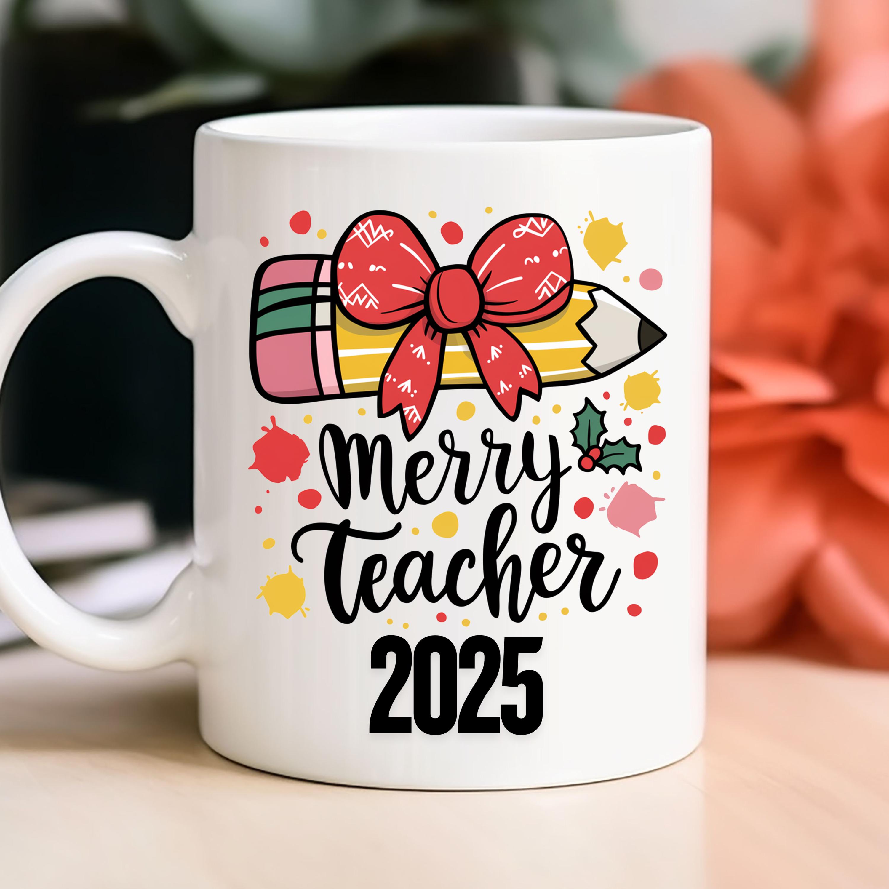 Celebrate Christmas 2025 with this Merry Teacher ceramic mug. Perfect as a gift for teachers during the holiday season, this mug features vibrant colors and Microwave and dishwasher safe, this mug is both practical and festive.