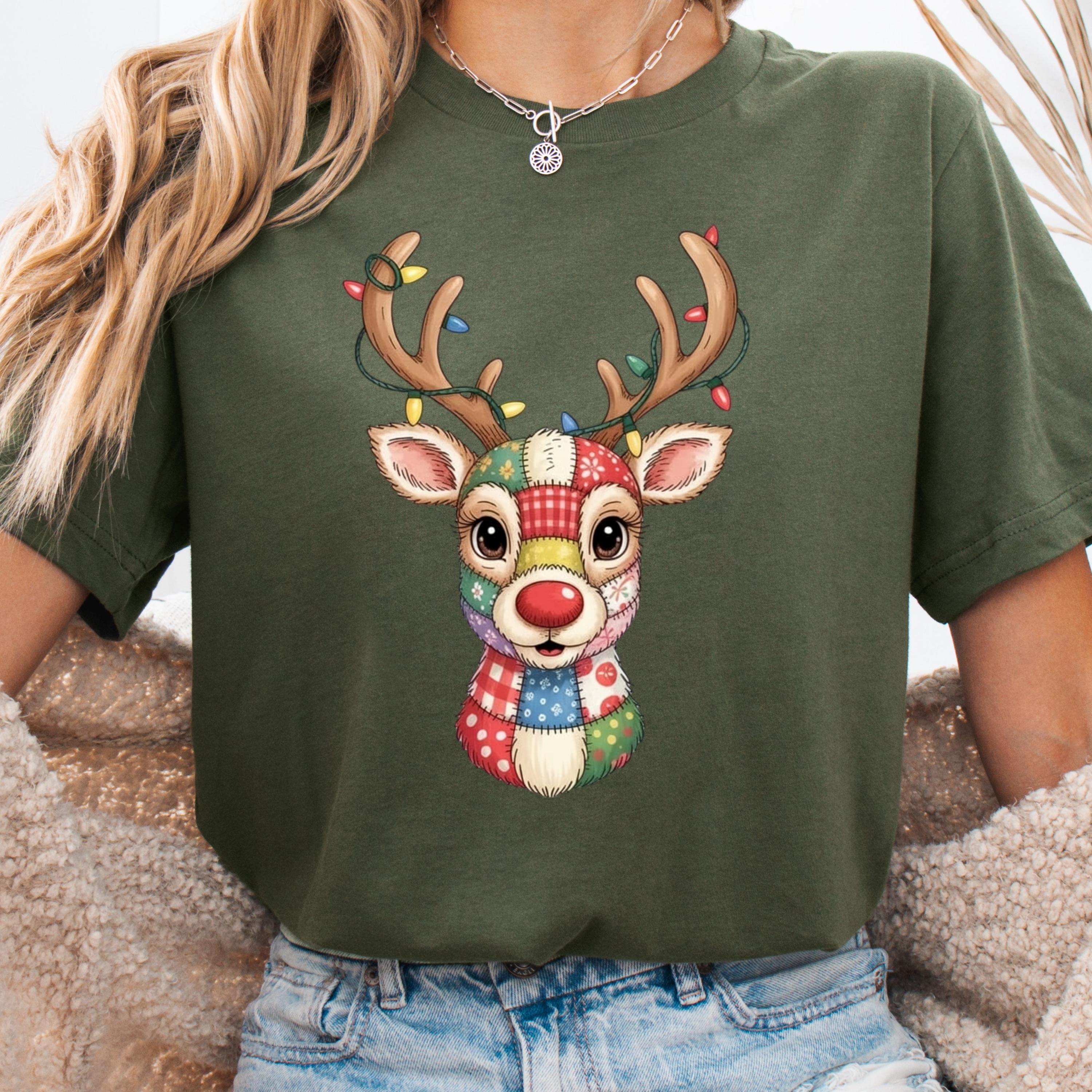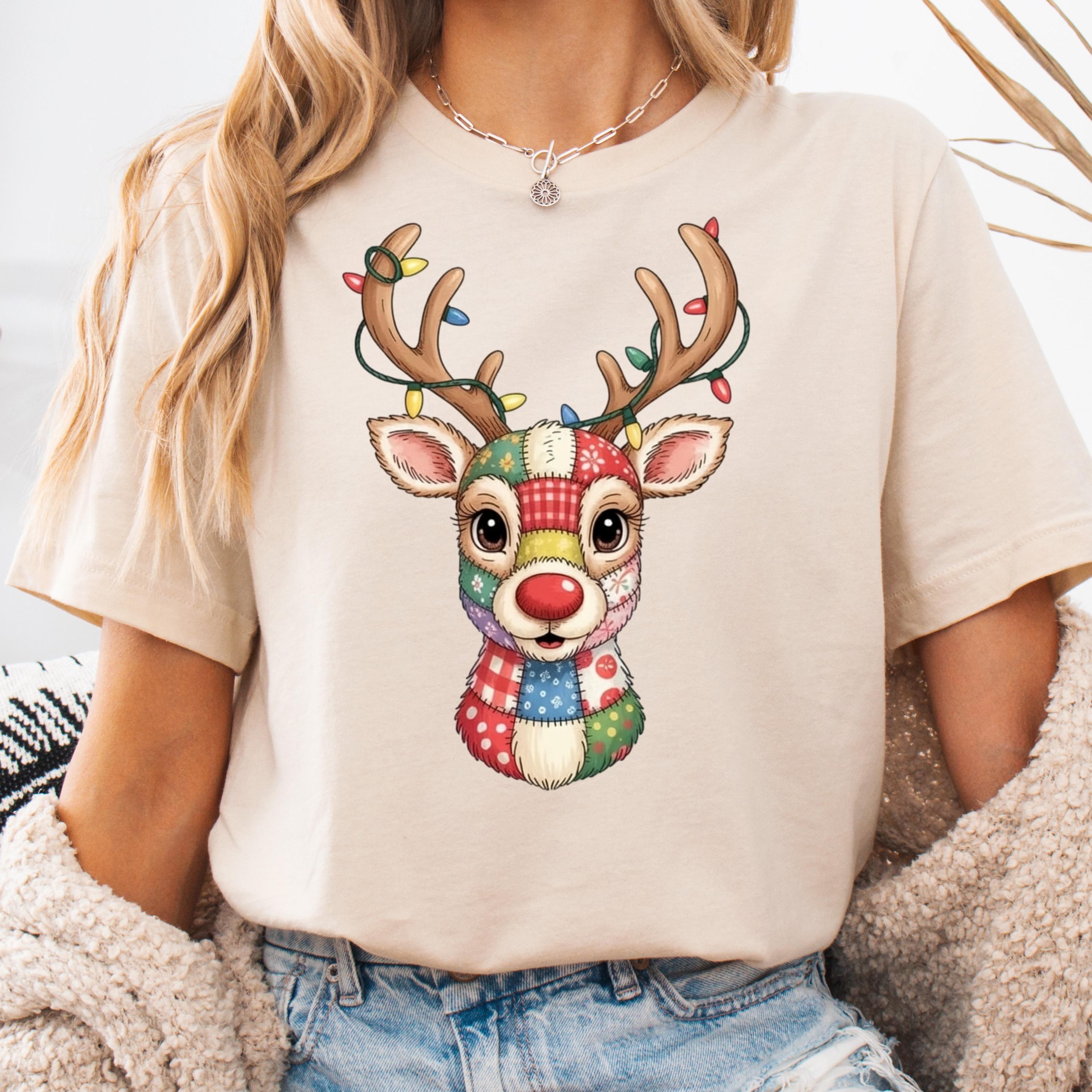 Patchwork Reindeer T-Shirt, Christmas Reindeer Shirt, Festive Deer Tee for Holiday Lovers