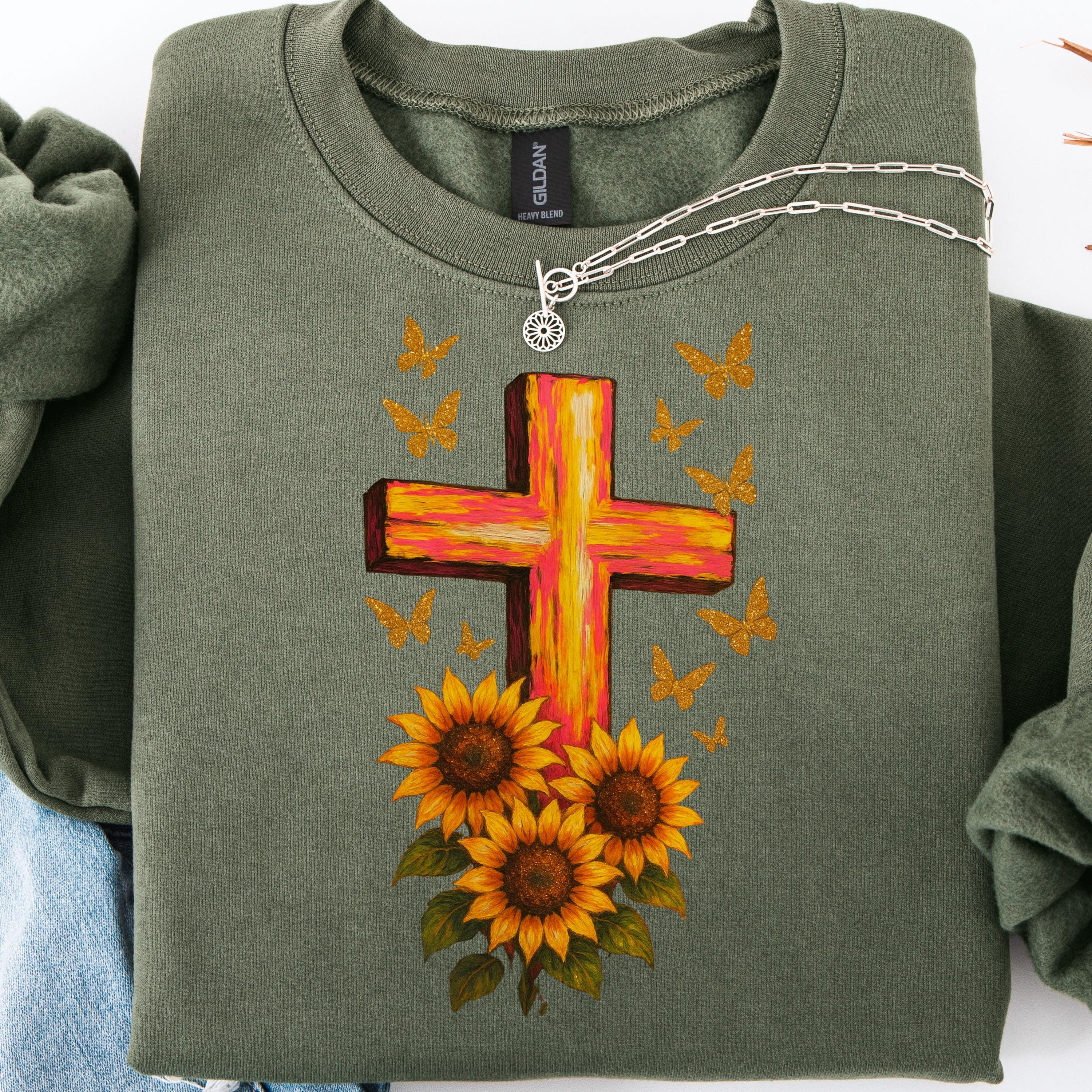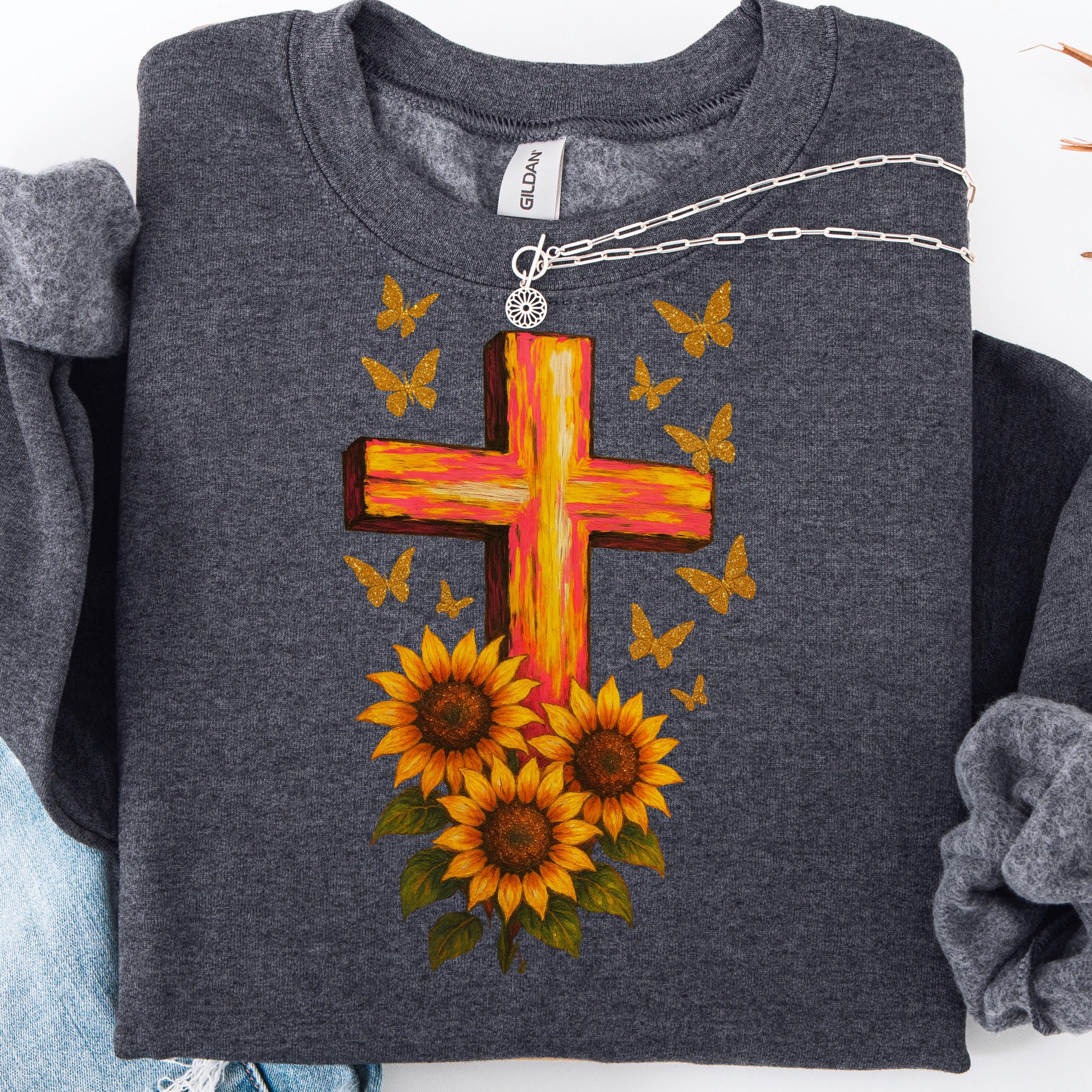 A Christian butterfly sunflower cross sweatshirt, perfect for new Christians looking to showcase their faith. This cozy and durable sweatshirt is designed for adults and provides a comfortable wearing experience with a classic fit and crew neckline. It is ideal for wearing during religious gatherings, church events, or casual everyday wear.