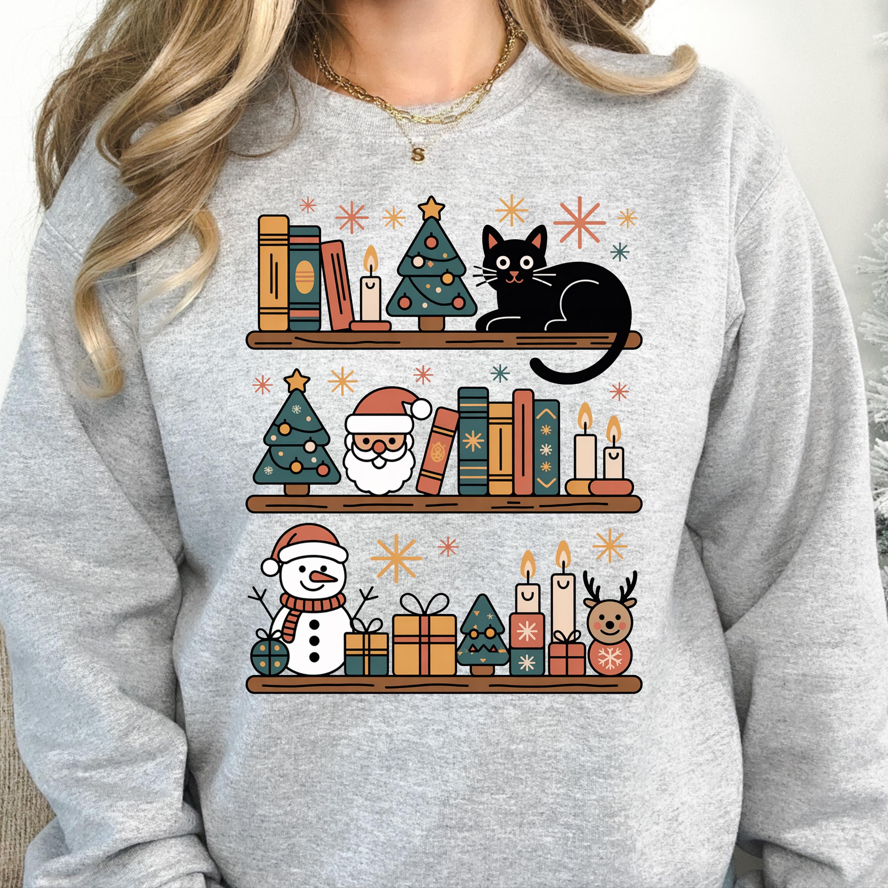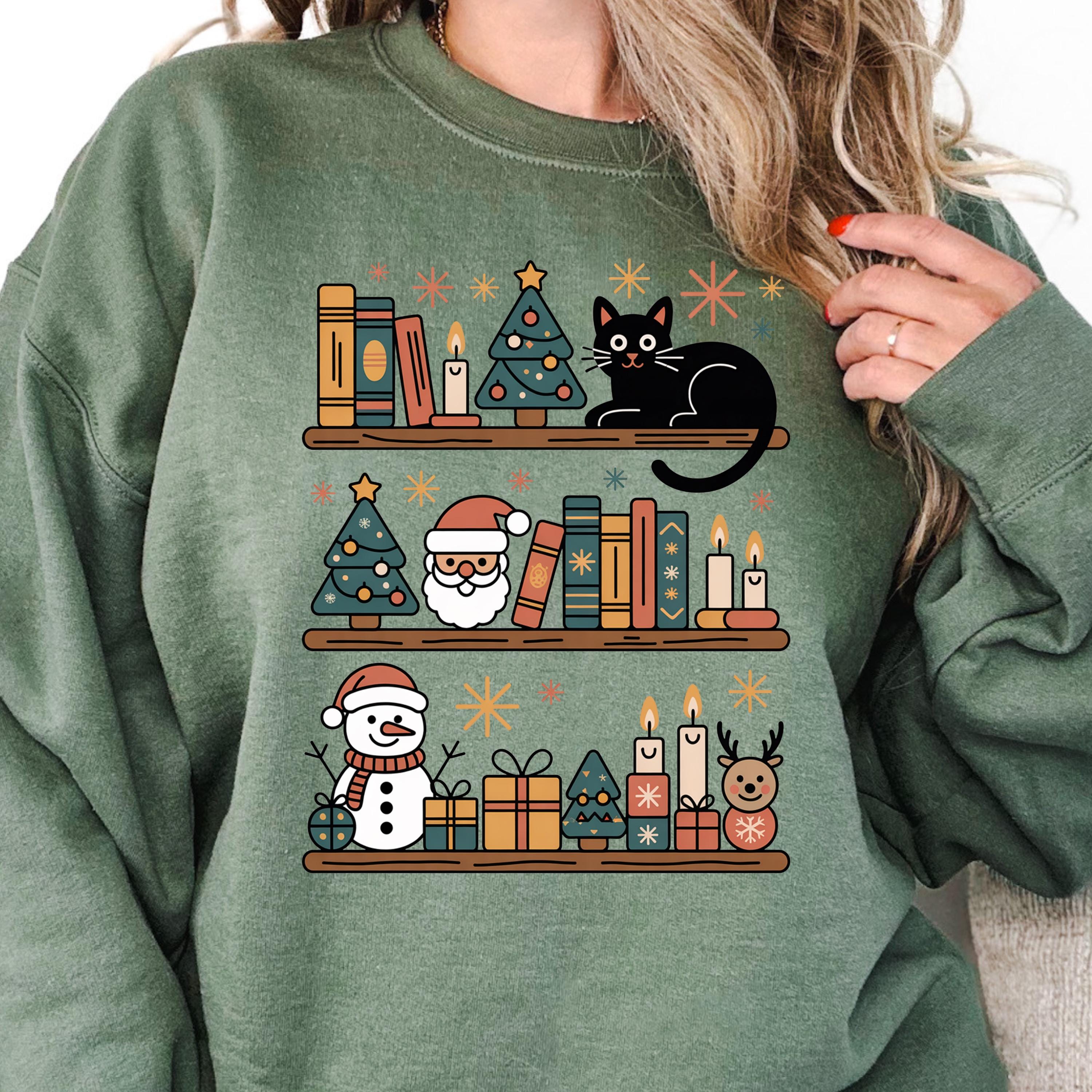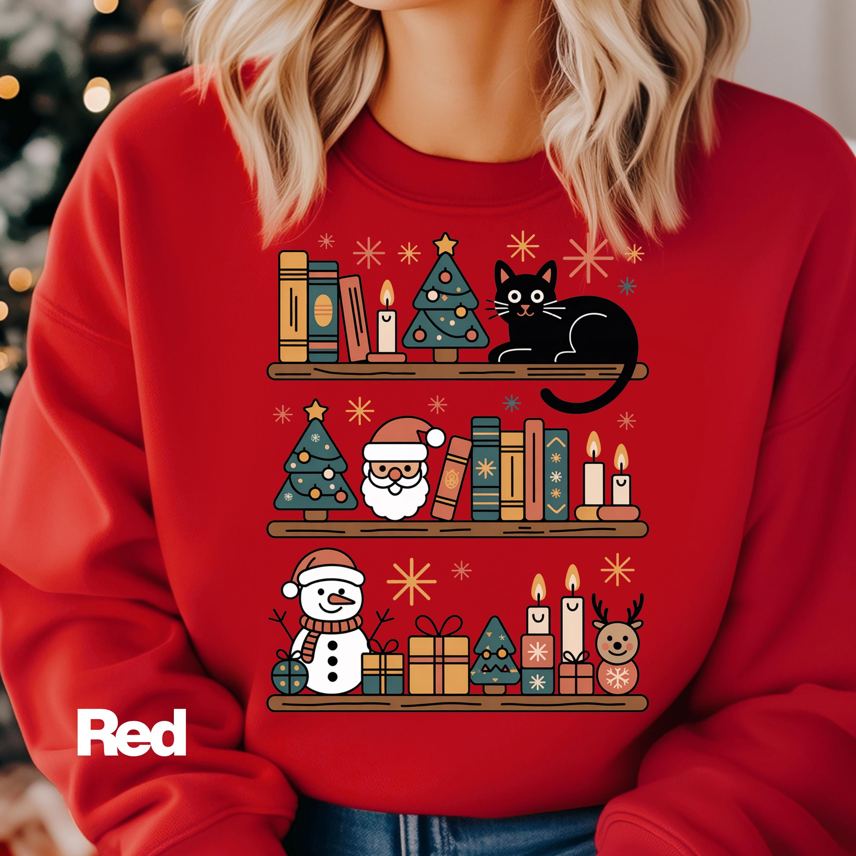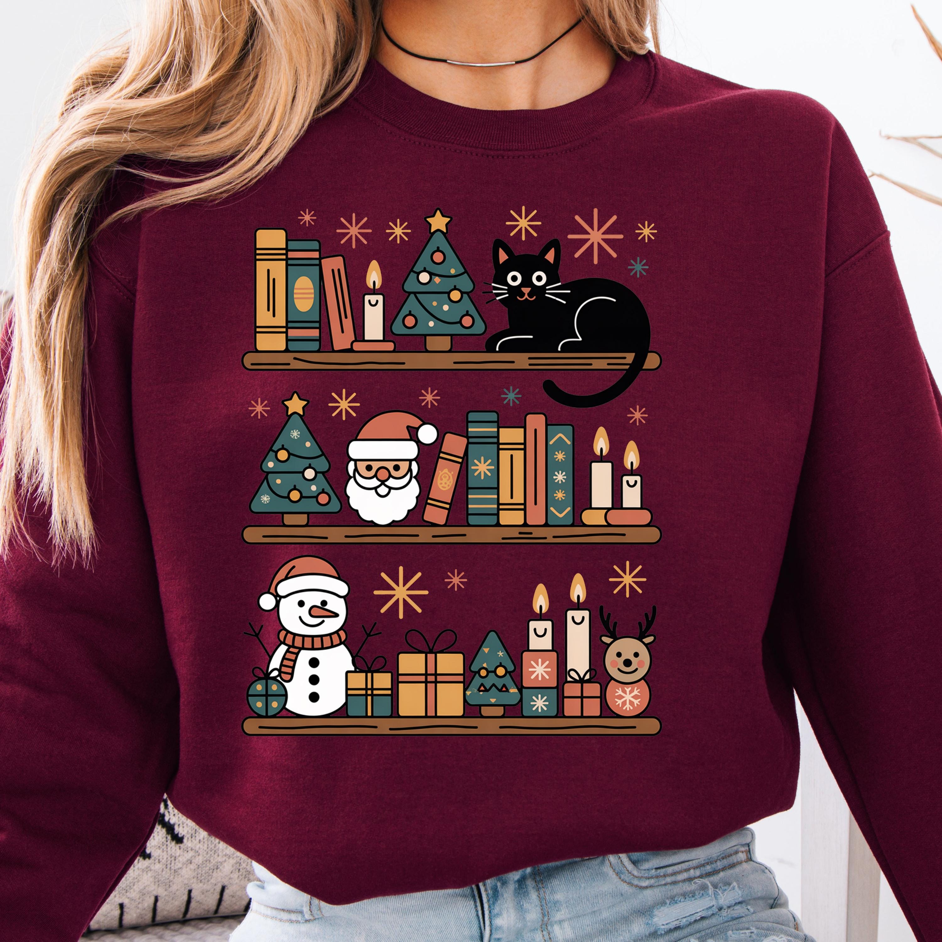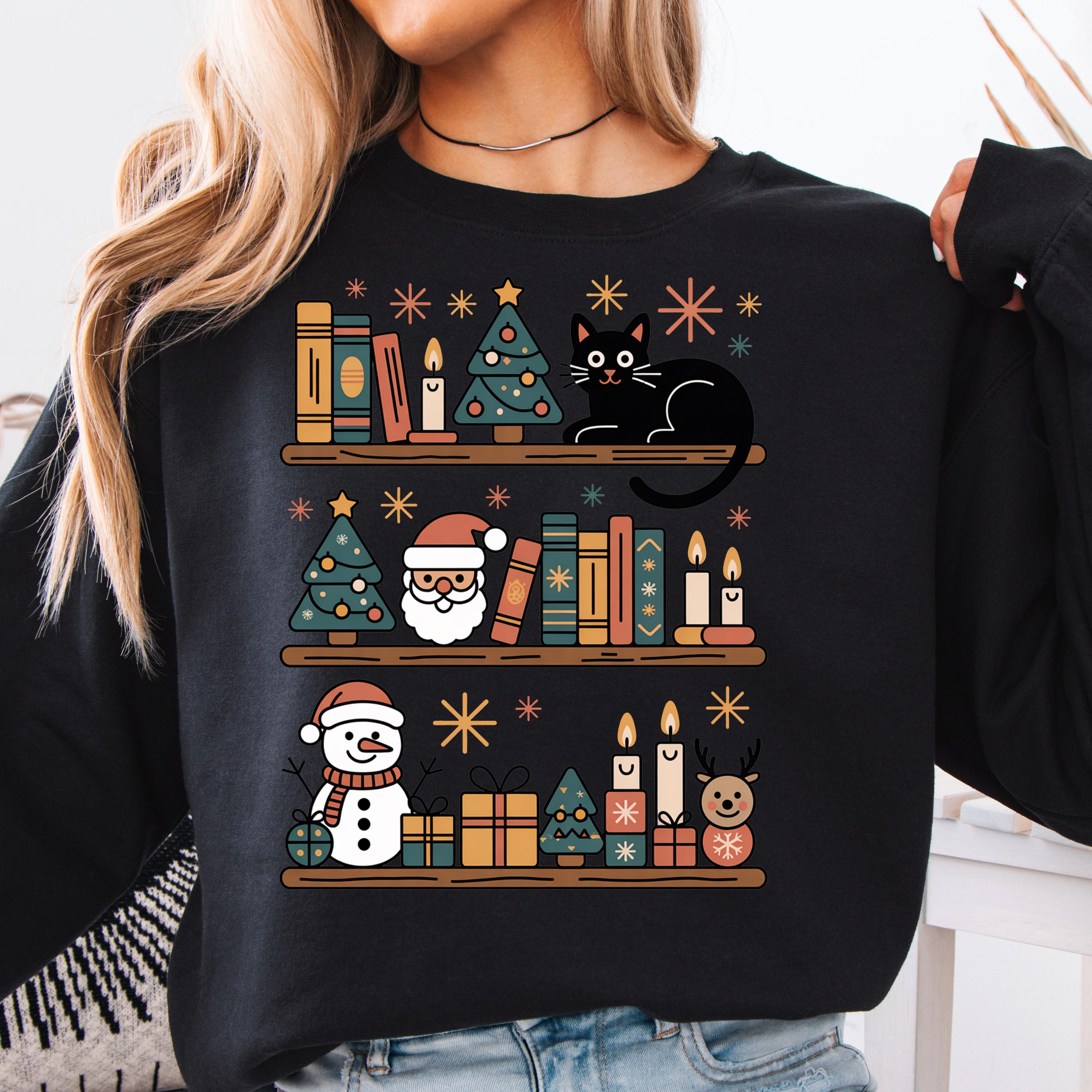 This Christmas Cat and Bookshelf Shirt is perfect for anyone who loves christmas cats and books and makes a great gift for christmas cat and bookshelf enthusiasts.