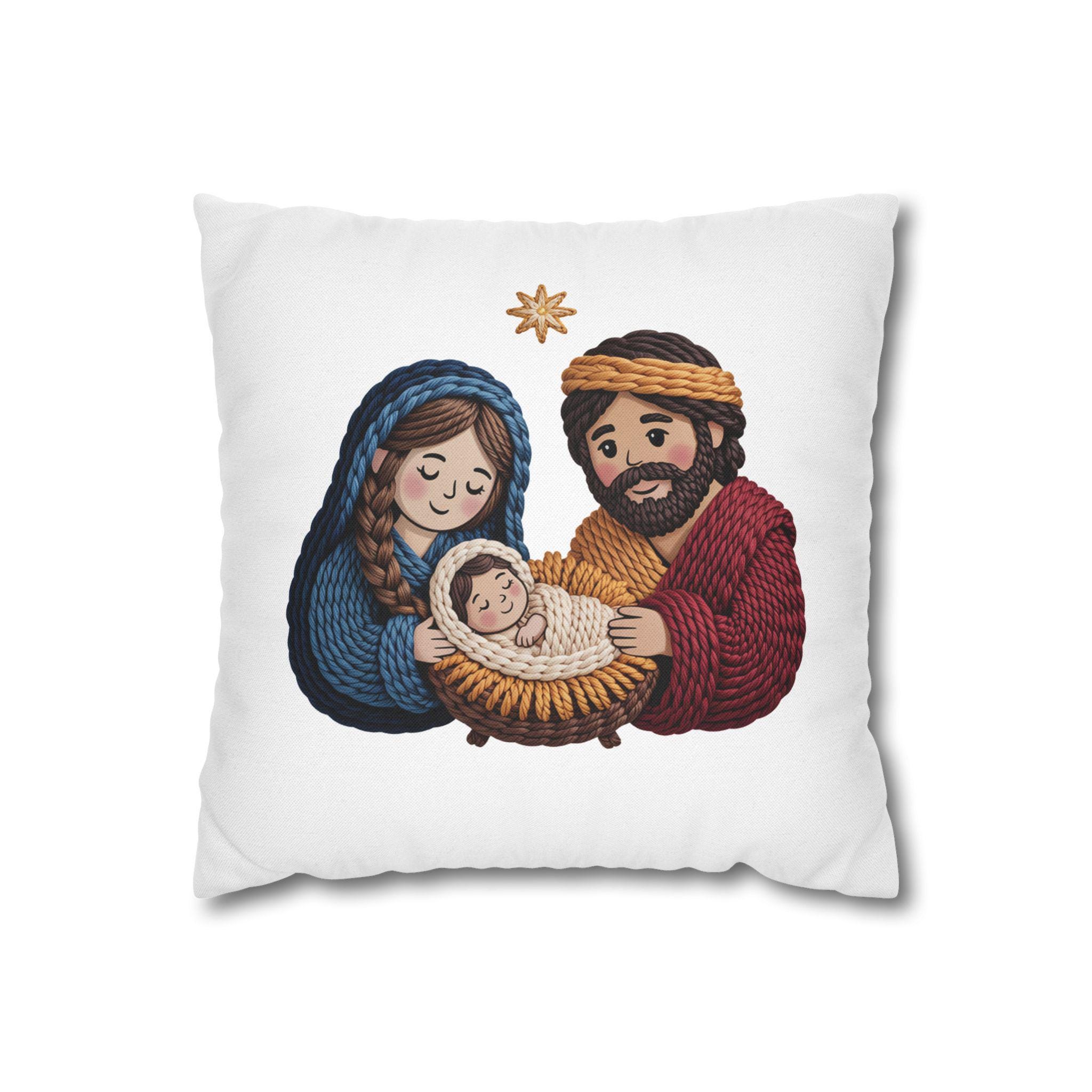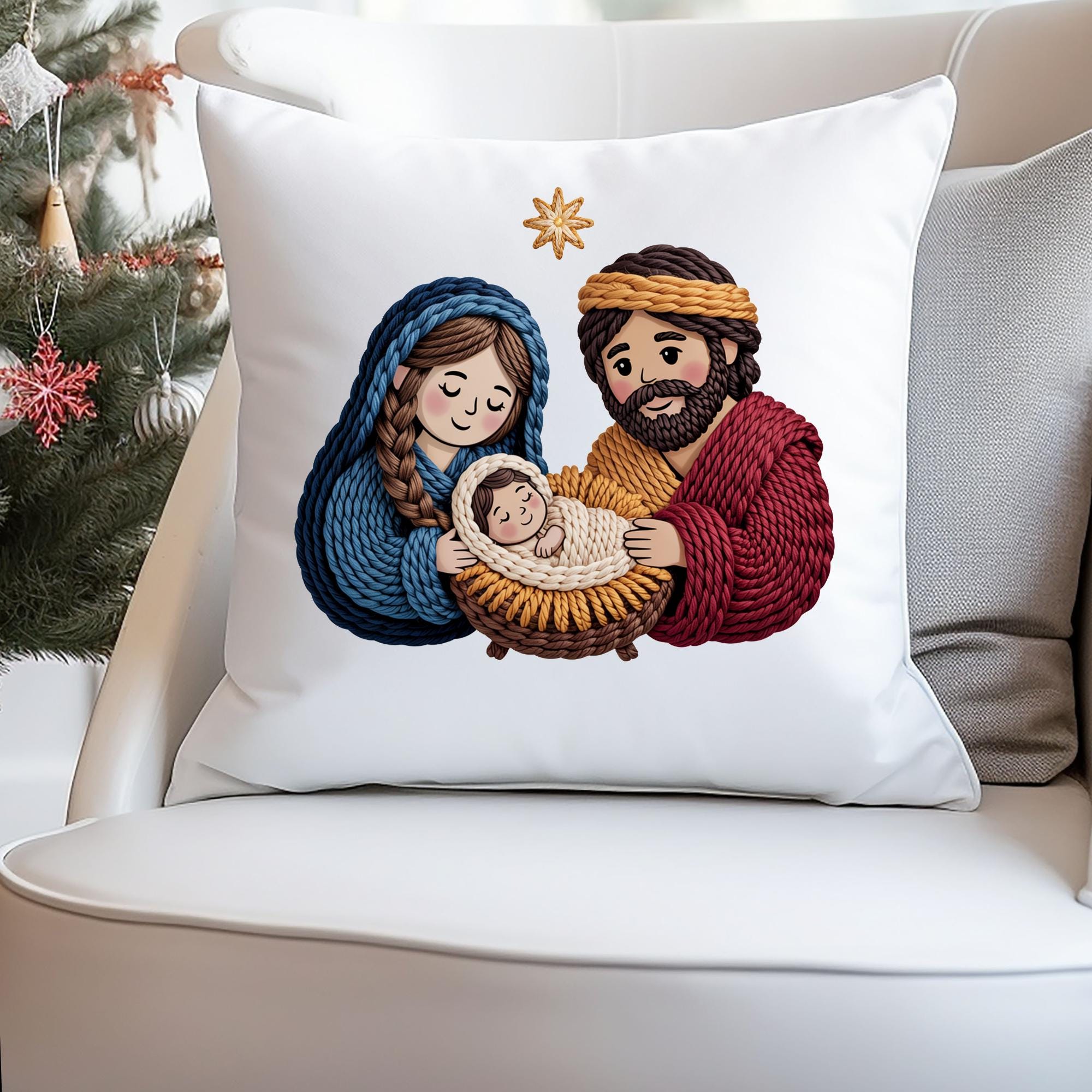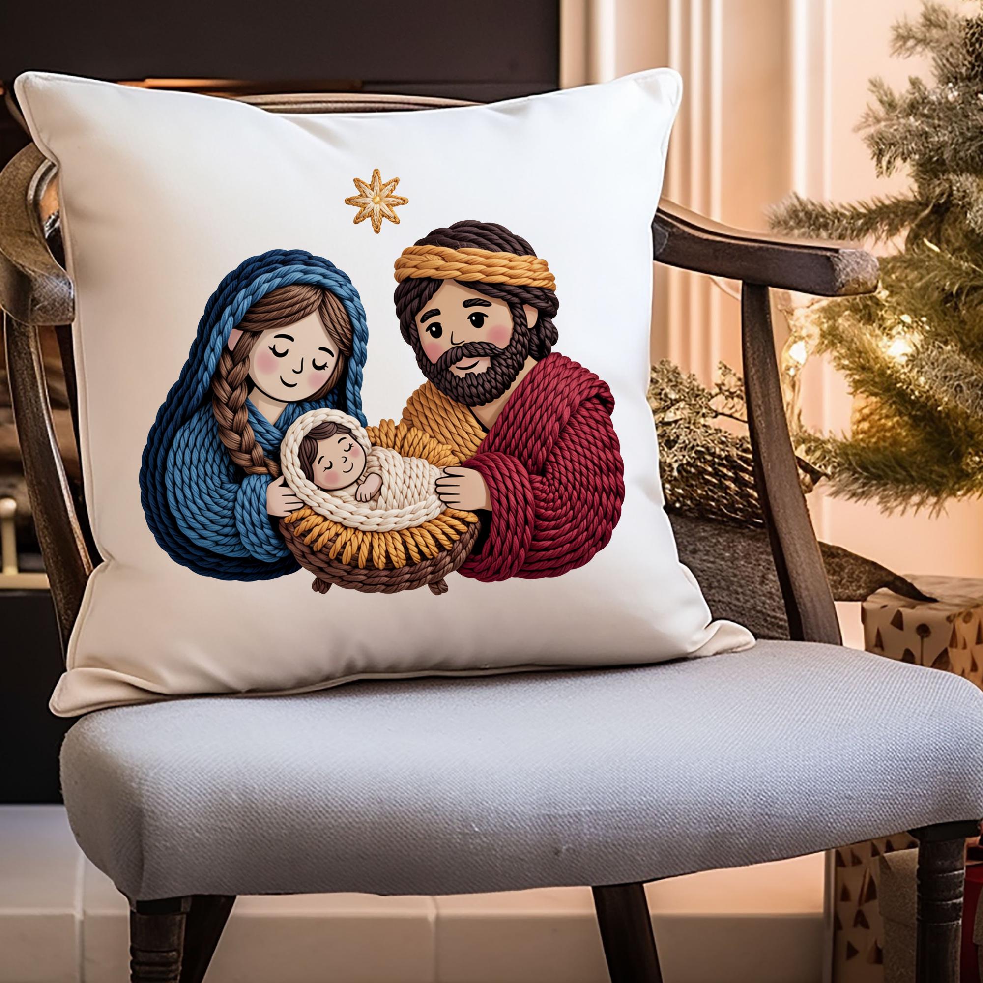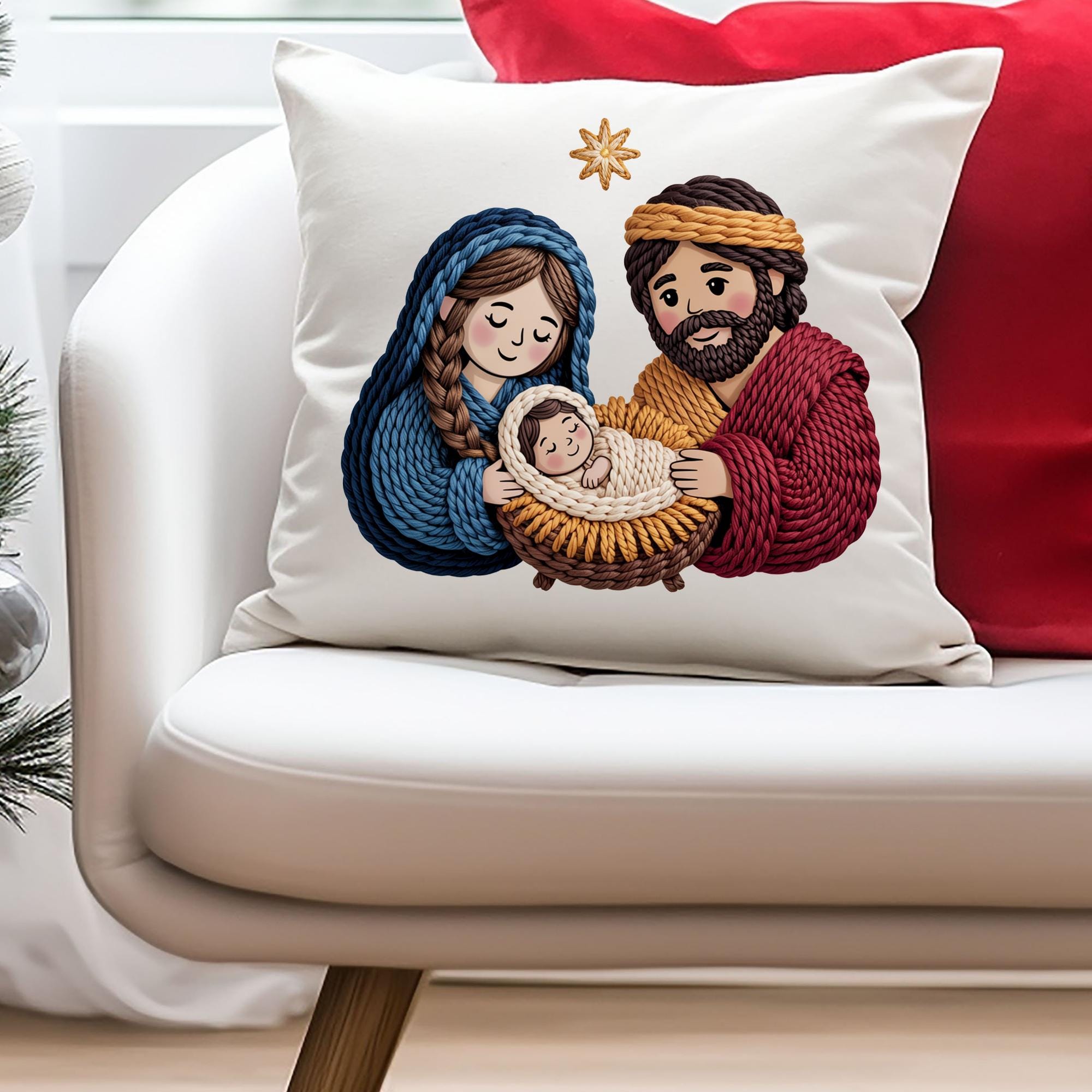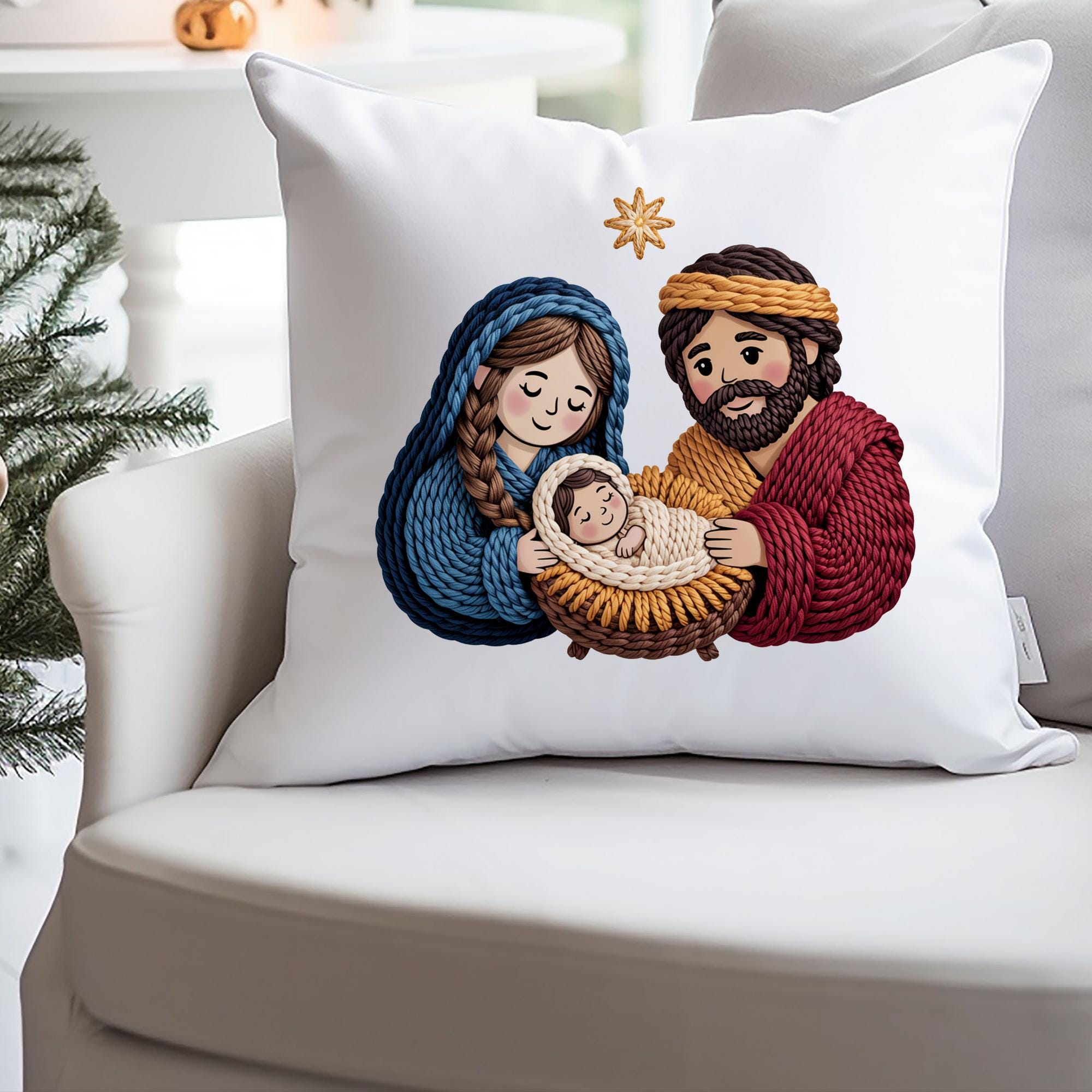 Faux Yarn Nativity scene pillow, perfect for Christmas home decor. This square pillowcase adds a cozy and festive touch to your living space, making it ideal for the holiday season. It is relevant to those who love to decorate their home for Christmas.