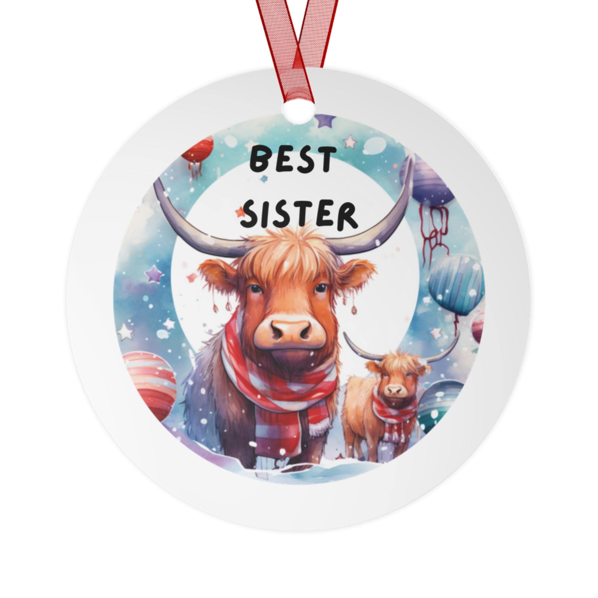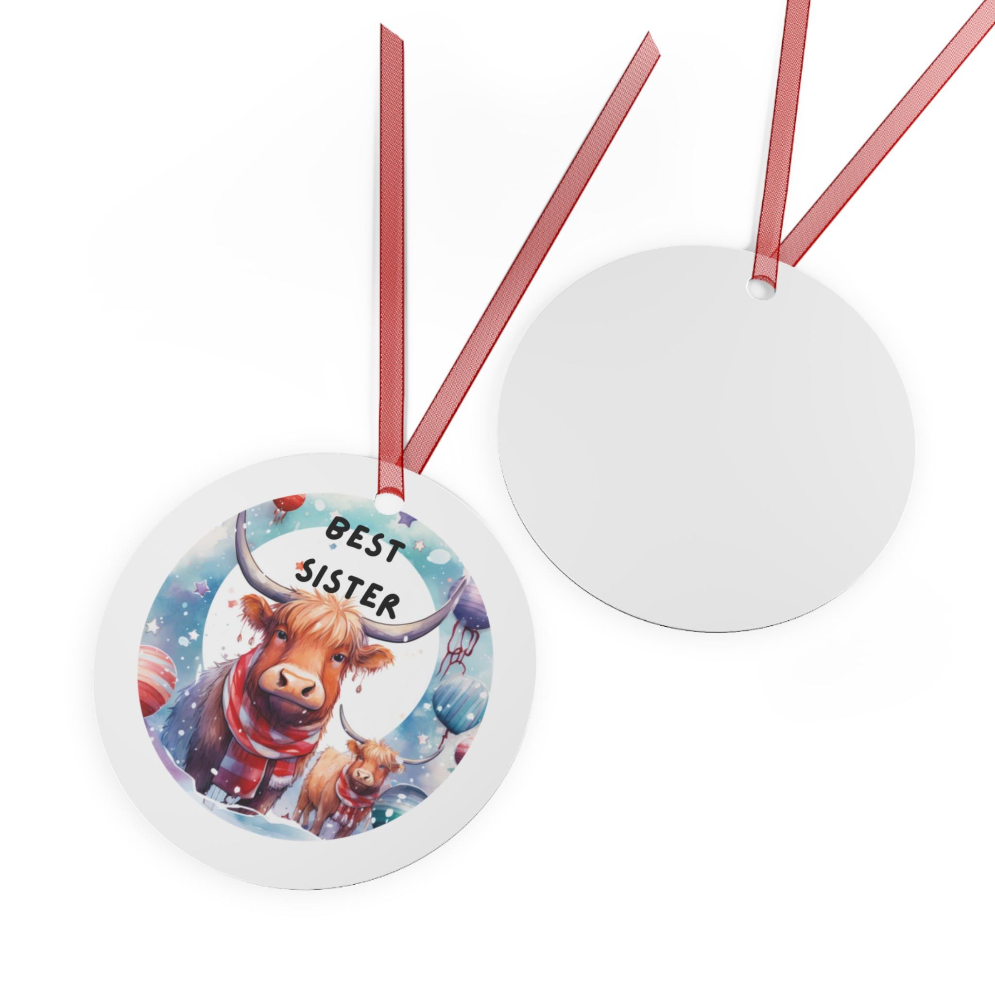 A gleaming metal ornament that celebrates sisterhood with a hand-drawn Highland cow illustration. The glossy white aluminum base makes the warm, detailed print stand out — bright reds and soft browns pop against the smooth finish. Lightweight and sturdy, it hangs easily from the included red ribbon and catches tree lights without scratching or chipping. This ornament feels like a little piece of hearth and home: rustic charm with a modern, durable build that will return each year to remind someone you love them.
