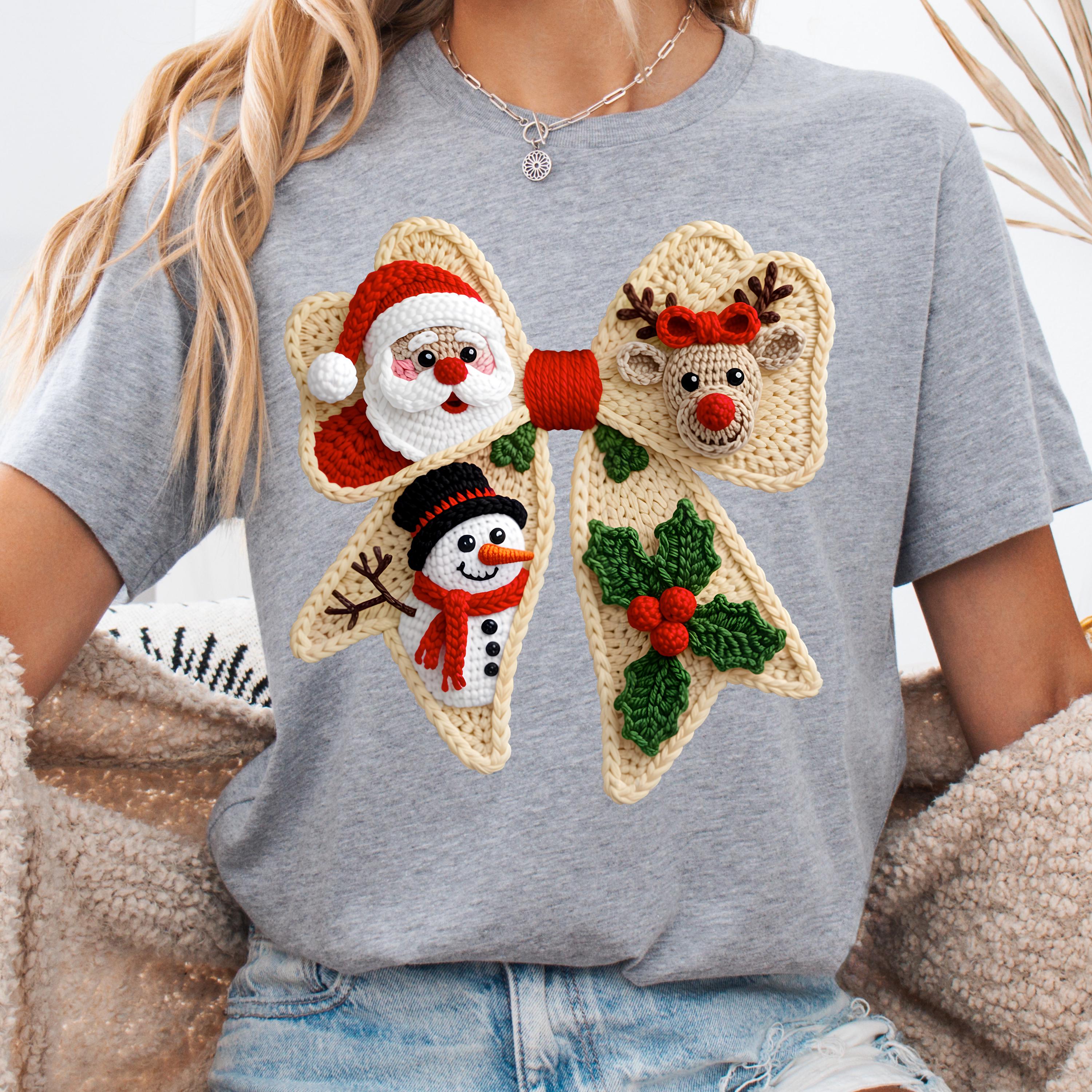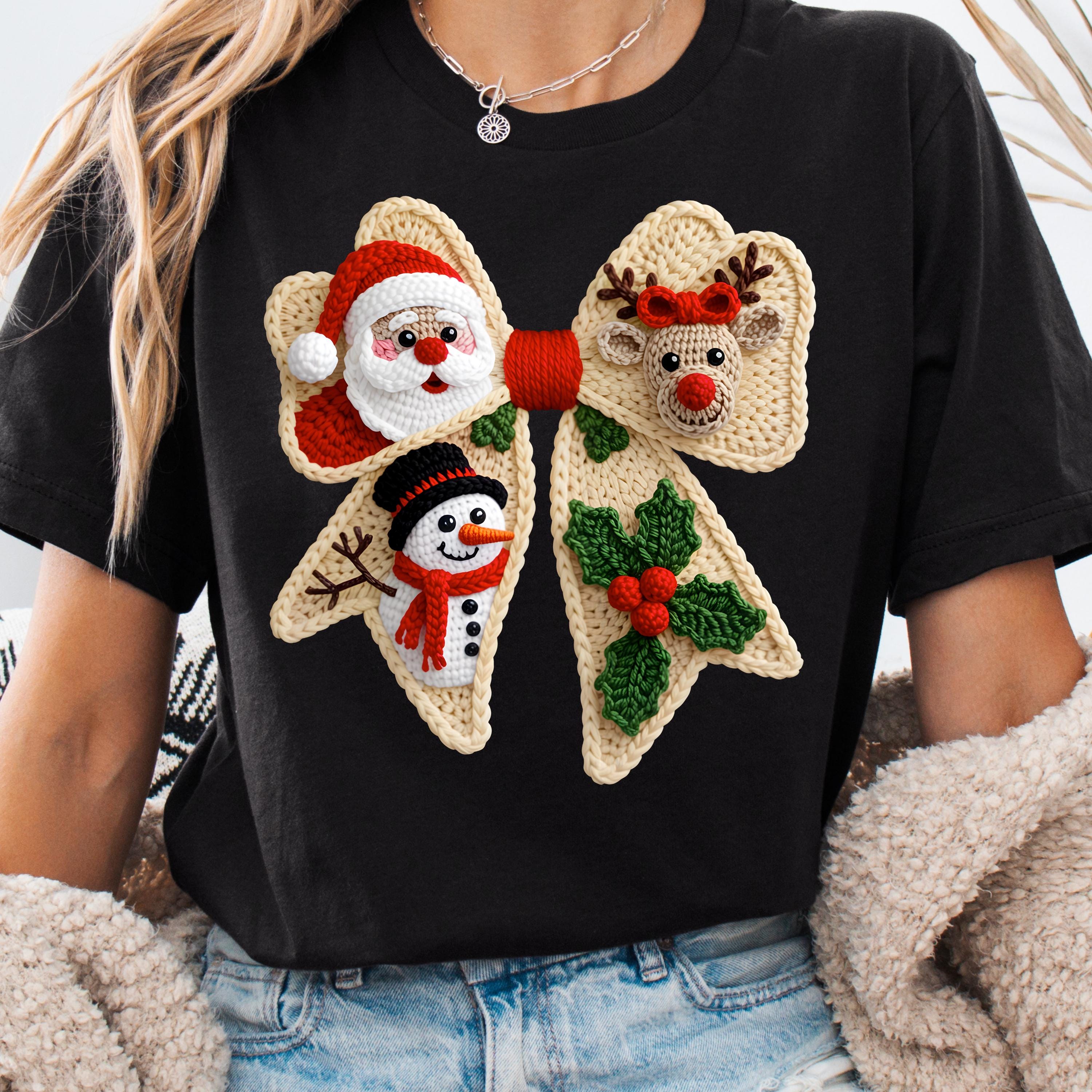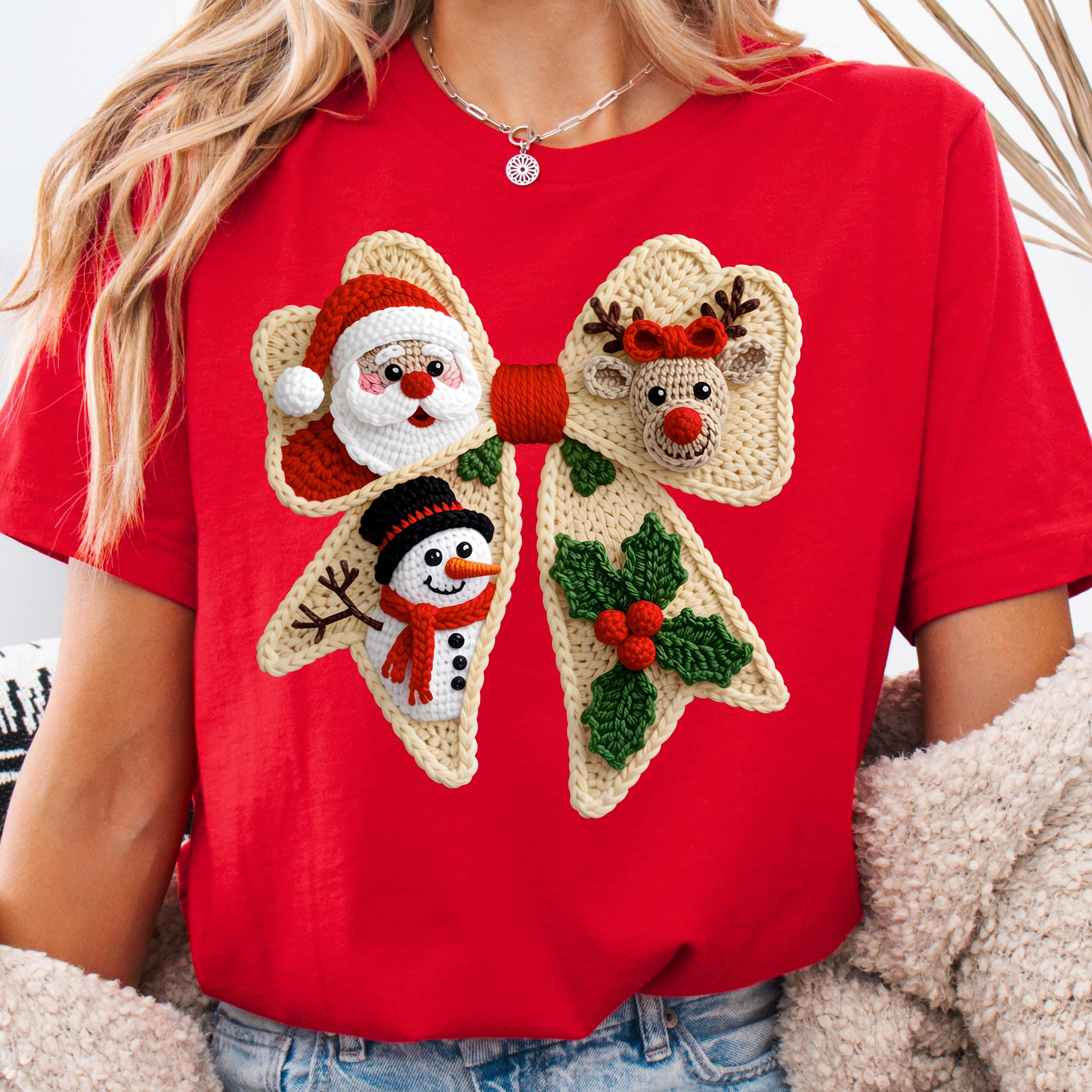 Faux Yarn Christmas Bow Shirt, Festive Tee for Holiday Cheer, Santa T-Shirt, Reindeer Gift